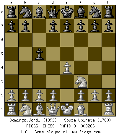 Last move : 1-0 2018 August 2 8:57:20 [Event "FICGS__CHESS__RAPID_B__000286"] [Site "FICGS"] [Date "2018.07.01"] [Round "1"] [White "Domingo,Jordi"] [Black "Souza,Ubirata"] [Result "1-0"] [WhiteElo "1892"] [BlackElo "1700"] 1.e4 c5 2.Nf3 1-0 This chess game has been lost on time (started : 2018.07.01 11:4:32) Sicilian defense Player White won this chess game. Follow this game move after move (download)The essence of Chess is thinking about what Chess is. (David Bronstein) Schach ist ein Kampf gegen den Fehler. (Johannes Herrman Zukertort) La partida mas dura de ganar es una partida ganada. (Emanuel Lasker) Avant la finale, les dieux ont créé le milieu de partie. (Tarrasch) Patience, use the Force, think ! (Obi-Wan Kenobi in Star Wars ep.2)