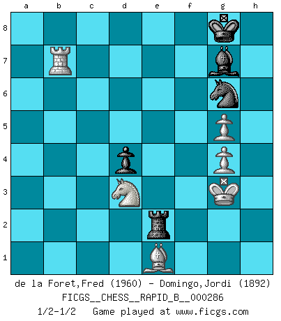 Last move : 1/2-1/2 2019 January 4 4:25:16 [Event "FICGS__CHESS__RAPID_B__000286"] [Site "FICGS"] [Date "2018.07.01"] [Round "1"] [White "de la Foret,Fred"] [Black "Domingo,Jordi"] [Result "1/2-1/2"] [WhiteElo "1960"] [BlackElo "1892"] 1.e4 e5 2.Nf3 d6 3.d4 Nf6 4.dxe5 Nxe4 5.Bc4 c6 6.O-O d5 7.Be2 Be7 8.c4 O-O 9.Nc3 f6 10.cxd5 Nxc3 11.bxc3 cxd5 12.exf6 Bxf6 13.Rb1 Nc6 14.Rb5 Ne7 15.Ba3 a6 16.Rb1 Bxc3 17.Qc2 Bf6 18.Bd3 g6 19.Rfe1 Re8 20.h4 Nf5 21.h5 Bd7 22.Rxe8+ Qxe8 23.Rxb7 Rc8 24.Qd2 Qe6 25.Bb2 d4 26.Ra7 Bb5 27.Bxb5 axb5 28.Qd3 Qc4 29.Qe4 Qc6 30.Qd3 Qc4 31.Qe4 Qc6 32.Qxc6 Rxc6 33.Ra5 b4 34.Rb5 Rc4 35.Ne1 Be7 36.hxg6 hxg6 37.Kf1 Rc6 38.g4 Nh4 39.Nd3 Rc2 40.Re5 Bf8 41.Re2 Rc8 42.f4 Ra8 43.Re5 Nf3 44.Re2 Nh4 45.Kf2 Rxa2 46.Kg3 g5 47.Re5 Bh6 48.fxg5 Bg7 49.Re8+ Kf7 50.Rb8 Ng6 51.Rb7+ Kg8 52.Rb8+ Kf7 53.Rxb4 Ra5 54.Bc1 Ra7 55.Rb5 Rc7 56.Bd2 Rc2 57.Rb7+ Kg8 58.Be1 Re2 1/2-1/2 Philidor : Nimzovich variation Kingside Castling by player White (move 6) Kingside Castling by player Black (move 8) This chess game ended in a draw. Follow this game move after move (download)An attack on the wing should be met by play in the center. (Nimzovitch) Ivan Sokolov treibt mich als Beifahrer an mit go Loeky go - . (Loek van Wely) Bobby Fischer es el mas grande genio de Ajedrez de todos los tiempos. (Alexander Kotov) C'est la seule position que je connaisse où les deux camps sont mals. Propos prêtés à V. Anand. 98% of all statistics are made up. (Author unknown)