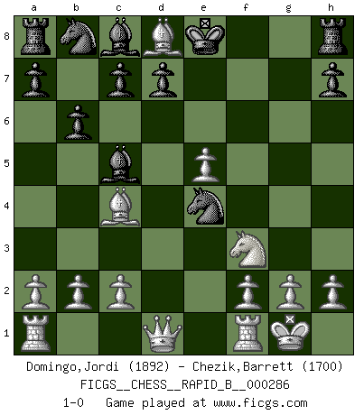 Last move : 1-0 2018 September 3 23:38:34 [Event "FICGS__CHESS__RAPID_B__000286"] [Site "FICGS"] [Date "2018.07.01"] [Round "1"] [White "Domingo,Jordi"] [Black "Chezik,Barrett"] [Result "1-0"] [WhiteElo "1892"] [BlackElo "1700"] 1.e4 e5 2.Nf3 Bd6 3.Bc4 b6 4.d4 Qe7 5.dxe5 Bc5 6.O-O Nh6 7.Nc3 Ng4 8.Nd5 Qd8 9.Bg5 f6 10.Nxf6+ gxf6 11.exf6 Nxf6 12.e5 Ne4 13.Bxd8 1-0 This chess game has been lost on time (started : 2018.07.01 11:4:32) King's knight Opening Kingside Castling by player White (move 6) Player White won this chess game. Follow this game move after move (download)Bobby Fischer is the greatest Chess player who has ever lived. (Ken Smith) Das Schachspiel hat wie die Liebe, die Musik, die Fähigkeit, den Menschen glücklich zu machen. Ich habe ein leises Gefühl des Bedauerns für jeden, der das Schachspiel nicht kennt, so wie ich jeden bedaure, der die Liebe nicht kennt. (Siegbert Tarrasch) Coloca el contenido del tablero de Ajedrez en un sombrero, agita las piezas vigorosamente, derrámalas en el tablero desde una altura de medio metro y así obtienes el estilo de Wilhelm Steinitz. (H. E. Bird) Vous savez, camarade Pachman, je n'éprouve pas de plaisir à être ministre, je jouerais plutôt aux échecs comme vous, ou alors ferais une révolution au Venezuela. (Che Guevara à Ludek Pachman, 'Checkmate in Prague', 1975) A journey of a thousand sites begins with a single click. (Author unknown)