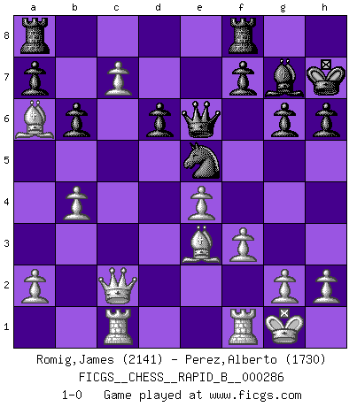 Last move : 1-0 2018 July 30 21:47:46 [Event "FICGS__CHESS__RAPID_B__000286"] [Site "FICGS"] [Date "2018.07.01"] [Round "1"] [White "Romig,James"] [Black "Perez,Alberto"] [Result "1-0"] [WhiteElo "2141"] [BlackElo "1730"] 1.c4 e5 2.Nf3 d6 3.Nc3 Nf6 4.d4 exd4 5.Nxd4 g6 6.e4 Bg7 7.Be2 O-O 8.Bg5 Qe8 9.f3 Bd7 10.Ndb5 Na6 11.O-O Qc8 12.Rc1 h6 13.Be3 b6 14.Qd2 Kh7 15.Nd5 Nxd5 16.cxd5 Nc5 17.b4 Bxb5 18.Bxb5 Nd7 19.Qc2 c5 20.dxc6 Ne5 21.c7 Qe6 22.Ba6 1-0 English, Nimzovich variation Kingside Castling by player Black (move 7) Kingside Castling by player White (move 11) Player White won this chess game. Follow this game move after move (download)It's always better to sacrifice your opponent's men. (Savielly Tartakover) Es gibt zwei Arten von Opfern: Korrekte und meine. (Mikhail Nekhemyevich Tal) Todos los jugadores de Ajedrez deberían tener un pasatiempo. (Savielly Tartakower) Il n'y a plus de joueurs du niveau de Jacob Murray dont la seule quête est le beau jeu, le plaisir de voir les pièces construire quelque chose. Sur 10 idées à la minute, 9 seront sans intérêt, la dernière s'avèrera géniale. (Christian Bauer) He who defends everything defends nothing. (Frederick the Great)