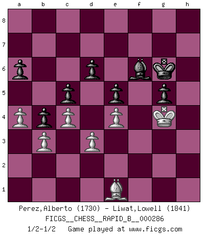 Last move : 1/2-1/2 2018 August 16 1:20:58 [Event "FICGS__CHESS__RAPID_B__000286"] [Site "FICGS"] [Date "2018.07.01"] [Round "1"] [White "Perez,Alberto"] [Black "Liwat,Lowell"] [Result "1/2-1/2"] [WhiteElo "1730"] [BlackElo "1841"] 1.c4 c5 2.e4 e5 3.Nc3 a6 4.Nf3 Nc6 5.Be2 d6 6.O-O h6 7.Nd5 g5 8.g3 Bh3 9.Re1 f5 10.d3 f4 11.Kh1 Nf6 12.Nxf6 Qxf6 13.Ng1 Be6 14.g4 b5 15.a4 b4 16.f3 h5 17.b3 Nd4 18.Ra2 hxg4 19.fxg4 O-O-O 20.Bf3 Rh4 21.Bb2 Nxf3 22.Qxf3 Bxg4 23.Qf1 Qh6 24.Bc1 Be7 25.Rg2 Rh8 26.Qf2 f3 27.Nxf3 Bxf3 28.Qxf3 Rxh2+ 29.Kg1 Rh1+ 30.Kf2 Rxe1 31.Kxe1 Qh1+ 32.Qf1 Qxf1+ 33.Kxf1 Rh1+ 34.Rg1 Rh3 35.Ke2 Rh2+ 36.Kd1 Rh5 37.Ke1 Kd7 38.Kf2 Rh2+ 39.Rg2 Rh1 40.Rg1 Rxg1 41.Kxg1 Ke6 42.Kf2 Kf6 43.Kg3 Kg6 44.Kg4 Bd8 45.Bd2 Bf6 46.Be1 1/2-1/2 English : Symmetrical variation Kingside Castling by player White (move 6) Queenside Castling by player Black (move 19) This chess game ended in a draw. Follow this game move after move (download)All my games are real. (Bobby Fischer) Korrekt heißt in Deutschland die Haltung eines Mannes, dessen Benehmen nach dem Urteile seiner Nachbarn seiner Stellung angemessen ist. Um korrekt zu sein, muß man sich der Meinung der anderen anpassen... (Emanuel Lasker) Bobby es la celebridad menos entendida y malinterpretada que camina el la faz de esta tierra. (Yasser Seirawan) La menace est plus forte que l'exécution. (Aaron Nimzovitch) There are two major products that came out of Berkeley: LSD and UNIX. We do not believe this is to be a coincidence. (Jeremy S. Anderson)