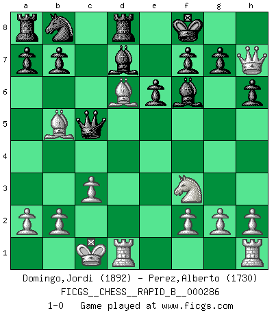 Last move : 1-0 2018 August 28 2:22:12 [Event "FICGS__CHESS__RAPID_B__000286"] [Site "FICGS"] [Date "2018.07.01"] [Round "1"] [White "Domingo,Jordi"] [Black "Perez,Alberto"] [Result "1-0"] [WhiteElo "1892"] [BlackElo "1730"] 1.e4 e6 2.d4 d5 3.Nc3 dxe4 4.Nxe4 h6 5.Nf3 Nf6 6.Bd3 Be7 7.Nxf6+ Bxf6 8.c3 O-O 9.Qe2 Qd6 10.Qe4 Rd8 11.Bf4 Qb6 12.Qh7+ Kf8 13.O-O-O c5 14.dxc5 Qxc5 15.Bb5 Bd7 16.Bd6+ 1-0 French : Rubinstein variation Kingside Castling by player Black (move 8) Queenside Castling by player White (move 13) Player White won this chess game. Follow this game move after move (download)Live, lose, and learn, by observing your opponent how to win. (Amber Steenbock) Die meiste Zeit treffe ich auf Gegner, die meine Enkel sein könnten. Ich bin da, um ihnen zu zeigen, dass sie von mir noch einiges lernen können. (Viktor Kortschnoi) Combinaciones deslumbrantes son para la mayoría, mover madera es para los pocos. (Georg Kieninger) Il vaut mieux sacrifier les pièces de l'adversaire. (Xavier Tartacover) A government big enough to give you everything you want is strong enough to take everything you have. (Thomas Jefferson)