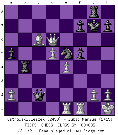 Last move : 1/2-1/2 2007 October 28 21:0:46 [Event "FICGS__CHESS__CLASS_SM__000005"] [Site "FICGS"] [Date "2007.05.11"] [Round "1"] [White "Ostrowski,Leszek"] [Black "Zubac,Marius"] [Result "1/2-1/2"] [WhiteElo "2458"] [BlackElo "2415"] 1.e4 c5 2.Nf3 Nc6 3.d4 cxd4 4.Nxd4 Nf6 5.Nc3 e5 6.Ndb5 d6 7.Bg5 a6 8.Na3 b5 9.Bxf6 gxf6 10.Nd5 f5 11.Bd3 Be6 12.O-O Bxd5 13.exd5 Ne7 14.Nxb5 Bg7 15.Nc3 e4 16.Bc4 Ng6 17.Qh5 Bxc3 18.bxc3 Qf6 19.Qh6 Qxc3 20.Bb3 Ke7 21.Rae1 Rhg8 22.Kh1 a5 23.Ba4 Rab8 24.f3 Rb4 25.Bc6 Qxc2 26.fxe4 Ne5 27.Qh4+ Kf8 28.Qd8+ Kg7 29.Qxd6 1/2-1/2 Sicilian : Pelikan (Lasker/Sveshnikov) variation Kingside Castling by player White (move 12) This chess game ended in a draw. Follow this game move after move (download)Some part of a mistake is always correct. (Savielly Tartakover) Schach ist Kampf, hauptsächlich jedoch gegen die eigenen Fehler. (Savielly Grigorievitsch Tartakower) El Ajedrez es tortura mental. (Garry Kasparov) Je fais ceci parce que dans cinquante coups j'obtiendrai cela; je m'appelle Mikhail Moisevitch Botvinnik. (Botvinnik) Who needs drugs and alcohol if he can play Big Chess at FICGS ? (Heinz-Georg Lehnhoff)