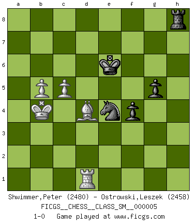 Last move : 1-0 2007 November 5 12:29:59 [Event "FICGS__CHESS__CLASS_SM__000005"] [Site "FICGS"] [Date "2007.05.11"] [Round "1"] [White "Shwimmer,Peter"] [Black "Ostrowski,Leszek"] [Result "1-0"] [WhiteElo "2480"] [BlackElo "2458"] 1.Nc3 d5 2.e3 e5 3.d4 e4 4.f3 Bb4 5.Bd2 Nc6 6.fxe4 Bxc3 7.Bxc3 Qh4+ 8.Kd2 Qxe4 9.Qf3 Nf6 10.Bd3 Qe7 11.Qf4 O-O 12.Ne2 a5 13.a3 Rd8 14.Ng3 Be6 15.Rhf1 h6 16.Ke2 Rd6 17.Rae1 Rb8 18.h3 b5 19.Kf2 b4 20.axb4 axb4 21.Bd2 b3 22.c3 g5 23.Qf3 Ne4+ 24.Bxe4 dxe4 25.Qxe4 Bc4 26.Qxe7 Nxe7 27.Rh1 Rf6+ 28.Kg1 Ra8 29.h4 Ra2 30.Bc1 Nd5 31.hxg5 hxg5 32.Ne4 Rc6 33.g4 Bd3 34.Nc5 Bc2 35.e4 Nf4 36.Kf2 Rxc5 37.dxc5 Nd3+ 38.Ke3 Ra4 39.Re2 Ne5 40.Rxc2 bxc2 41.b4 f6 42.Kd2 Ra2 43.c4 Nxc4+ 44.Kc3 Ne5 45.Bb2 Nxg4 46.Kxc2 Nf2 47.Re1 Kf7 48.Re2 Ng4 49.Kb3 Ra8 50.Rg2 Ne3 51.Rh2 Ke6 52.b5 Rb8 53.Kb4 Ng4 54.Rh7 Nf2 55.Bd4 Nxe4 56.Rxc7 Rd8 57.Rc6+ Kd5 58.Be3 Rh8 59.Rc7 f5 60.Rd7+ Ke6 61.Rd1 f4 62.Bd4 1-0 Dunst (Sleipner, Heinrichsen) Opening Kingside Castling by player Black (move 11) 10 pieces endgame at move 56 : White KRBPP , Black KRNPP WHITE : King + 1 Rook 1 Bishop 2 Pawns BLACK : King + 1 Rook 1 Knight 2 Pawns Player White won this chess game. Follow this game move after move (download)A man without frontiers. He didn't divide the East and the West, he brought them together in their admiration for him. (Ljubomir Ljubojevic, about Bobby Fischer's death) Es tut gut, die Entwicklungsperiode von, [...] demokratischem Geist durchdringen zu lassen. Wie undemokratisch wäre es doch beispielsweise, den einen Offizier große Spaziertouren vornehmen zu lassen, während die anderen zu Hause säßen und sich entsetzlich langweilten. (Aaron Nimzowitsch) La vida es como el Ajedrez, con lucha, competición y eventos buenos y malos. (Benjamin Franklin) On entre au jeu d'Echecs comme on entre en Religion. Pour le joueur d'Echecs, la partie d'Echecs c'est l'office, la messe, le défilé du 1er Mai, le dépôt de gerbe au Monument aux Morts. C'est un drame sacré. (Michel Roos) When you don't know what to do, walk fast and look worried. (Anonymous)