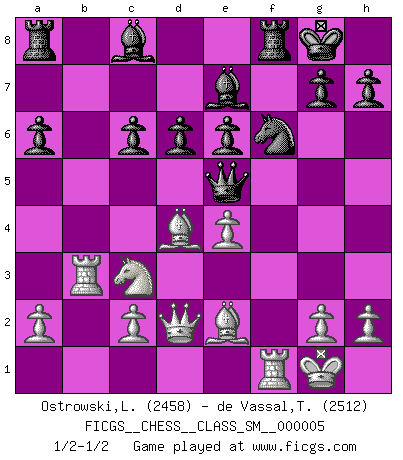 Last move : 1/2-1/2 2007 July 12 20:52:29 [Event "FICGS__CHESS__CLASS_SM__000005"] [Site "FICGS"] [Date "2007.05.11"] [Round "1"] [White "Ostrowski,Leszek"] [Black "de Vassal,Thibault"] [Result "1/2-1/2"] [WhiteElo "2458"] [BlackElo "2512"] 1.e4 c5 2.Nf3 d6 3.d4 cxd4 4.Nxd4 Nf6 5.Nc3 a6 6.Bg5 e6 7.f4 Qb6 8.Qd2 Qxb2 9.Rb1 Qa3 10.f5 Nc6 11.fxe6 fxe6 12.Nxc6 bxc6 13.Be2 Be7 14.O-O O-O 15.Rb3 Qc5+ 16.Be3 Qe5 17.Bd4 Qa5 18.Bb6 Qe5 19.Bd4 1/2-1/2 Sicilian : Najdorf, 7...Qb6 Kingside Castling by player White (move 14) Kingside Castling by player Black (move 14) This chess game ended in a draw. Follow this game move after move (download)Chess is thirty to forty percent psychology. You don't have this when you play a computer. I can't confuse it. (Judith Polgar) Wer mein Gambit spielt, muß bereit sein, alle Brücken hinter sich abzubrechen. Es verändert den ganzen Menschen. Es wirkt wie ein Zauberstab und fördert verkümmerte, gute Charakter- eigenschaften wieder zu Tage. (Emil Joseph Diemer) Realmente no sabemos como el juego fue inventado, aunque hay sospechas. Tan pronto como descubramos a los culpables, se los haremos saber. (Bruce Pandolfini) À la honte des hommes, on sait que les lois du jeu sont les seules qui soient partout justes, claires, inviolables et exécutées. Pourquoi l'Indien qui a donné les règles du jeu d'échecs est-il obéi de bon gré dans toute la terre, et que les décrétales des papes, par exemple, sont aujourd'hui un objet d'horreur et de mépris ? C'est que l'inventeur des échecs combina tout avec justesse pour la satisfaction des joueurs, et que les papes, dans leurs décrétales, n'eurent en vue que leur seul avantage. L'Indien voulut exercer également l'esprit des hommes et leur donner du plaisir; les papes ont voulu abrutir l'esprit des hommes. Voltaire (Dictionnaire philosophique / Garnier 1967) My poor ole parrot... Is not in the circulation of displays ....poo hoo hoo :) (Wayne Lowrance's enigma)