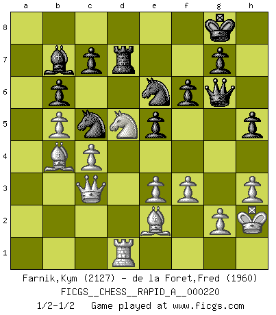 Last move : 1/2-1/2 2018 September 9 12:15:25 [Event "FICGS__CHESS__RAPID_A__000220"] [Site "FICGS"] [Date "2018.07.01"] [Round "1"] [White "Farnik,Kym"] [Black "de la Foret,Fred"] [Result "1/2-1/2"] [WhiteElo "2127"] [BlackElo "1960"] 1.c4 Nf6 2.Nf3 e6 3.Nc3 Bb4 4.Qc2 O-O 5.a3 Bxc3 6.Qxc3 b6 7.b4 Bb7 8.Bb2 a5 9.e3 Qe7 10.Be2 axb4 11.axb4 Rxa1+ 12.Bxa1 Na6 13.b5 Nc5 14.O-O Ra8 15.Qc2 d6 16.d4 Ncd7 17.Rc1 h6 18.Ne1 Nh7 19.Bb2 Ng5 20.Nd3 e5 21.h3 Be4 22.Qd2 Qf6 23.dxe5 dxe5 24.f3 Bb7 25.Rd1 Ne6 26.Bf1 Qg6 27.Kh2 f6 28.Bc3 Kh7 29.Nb4 Ndc5 30.Nd5 Rd8 31.Bb4 Rd7 32.Be2 Kg8 33.Qb2 Kh7 34.Qa1 h5 35.Qc3 Kg8 1/2-1/2 English Opening Kingside Castling by player Black (move 4) Kingside Castling by player White (move 14) This chess game ended in a draw. Follow this game move after move (download)There just isn't enough televised Chess. (David Letterman) Ein Schachgenie ist jemand der verdammt gut Schach spielt. (Jonathan Levitt) En un gambito tu regalas un Peón por el bién de tomar un juego perdido. (Samuel Standige Boden) Les écrivains ont utilisé les échecs pour analyser les côtés extrêmes de la nature humaine. Dans ce cadre, les échecs offrent un champ d'expérimentation idéal. Mais on pourrait faire la même chose avec la peinture. Et là, en vous référant à Van Gogh, vous ne tirerez pas de conclusion définitive sur les peintres. (Gary Kasparov) I believe in luck. How else can you explain the success of those you dislike ? (Jean Cocteau)