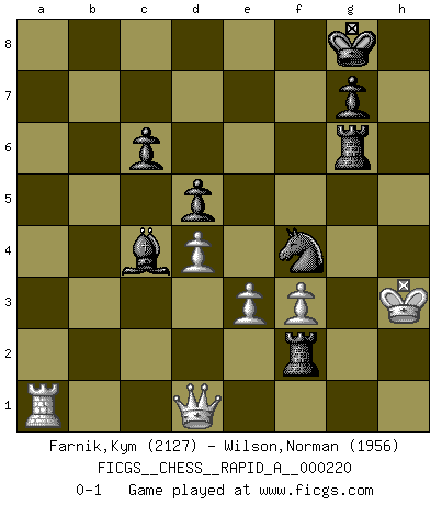 Last move : 0-1 2018 July 21 10:4:13 [Event "FICGS__CHESS__RAPID_A__000220"] [Site "FICGS"] [Date "2018.07.01"] [Round "1"] [White "Farnik,Kym"] [Black "Wilson,Norman"] [Result "0-1"] [WhiteElo "2127"] [BlackElo "1956"] 1.d4 Nf6 2.c4 e6 3.Nf3 b6 4.g3 Ba6 5.b3 Bb4+ 6.Bd2 Be7 7.Bg2 d5 8.cxd5 exd5 9.O-O O-O 10.Nc3 Bb7 11.Rc1 Nbd7 12.Ne1 Re8 13.Nd3 a5 14.Bf4 c6 15.Rc2 Bf8 16.Na4 h6 17.Ne5 b5 18.Nxd7 Nxd7 19.Nb2 Nf6 20.Nd3 b4 21.Nc5 Bc8 22.Rc1 Bf5 23.e3 Bxc5 24.Rxc5 Re6 25.h3 Qe7 26.g4 Bg6 27.Qd2 Ra7 28.Rfc1 Qb7 29.Re1 a4 30.f3 axb3 31.axb3 Ra3 32.Qd1 Qe7 33.Rc1 Nd7 34.Bf1 Nf8 35.Kf2 f5 36.Re2 fxg4 37.hxg4 h5 38.Bh3 Qh4+ 39.Kg1 Qxh3 40.Rh2 hxg4 41.Rxh3 gxh3 42.Qe2 Rxb3 43.Kh2 Bd3 44.Qa2 Bc4 45.Qc2 Ra3 46.Kxh3 b3 47.Qd2 Ra4 48.Rb1 Rg6 49.Qd1 Ra2 50.Rxb3 Rf2 51.Rb1 Ne6 52.Ra1 Nxf4+ 0-1 Queen's Indian : Nimzovich variation (exaggerated Fianchetto) Kingside Castling by player White (move 9) Kingside Castling by player Black (move 9) Player Black won this chess game. Follow this game move after move (download)A bad day of Chess is better than any good day at work. (Anonymous) Ihnen, Herr Lasker, habe ich nur drei Worte zu sagen: Schach und matt. (Siegbert Tarrasch) El Ajedrez es el arte del análisis. (Mikhail Botvinnik) L'attaque fait le spectacle, la défense gagne les matchs. (Dicton footballistique) I've lost money so fast in these clubs it's left me reeling. I've read every poker book ever written, but the only way to get better at the game is to go out and play with people who are really good. The problem is, you stand to lose a lot of money doing it. (Matt Damon)