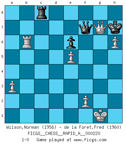Last move : 1-0 2018 September 21 22:39:54 [Event "FICGS__CHESS__RAPID_A__000220"] [Site "FICGS"] [Date "2018.07.01"] [Round "1"] [White "Wilson,Norman"] [Black "de la Foret,Fred"] [Result "1-0"] [WhiteElo "1956"] [BlackElo "1960"] 1.d4 Nf6 2.Nf3 e6 3.c4 b6 4.Nc3 Bb7 5.a3 d5 6.cxd5 Nxd5 7.Qc2 Nxc3 8.bxc3 Be7 9.e4 c5 10.Bb5+ Bc6 11.Bd3 Bb7 12.O-O cxd4 13.cxd4 O-O 14.Bf4 h6 15.Rfe1 Bd6 16.e5 Be7 17.Qe2 Re8 18.Rec1 Qd7 19.h4 Nc6 20.Qe4 g6 21.Bb5 Rac8 22.Bxh6 a6 23.Be2 Nb4 24.Qf4 Nc2 25.Ra2 Bxf3 26.Bxa6 Qd5 27.Raxc2 Rxc2 28.Rxc2 Bxg2 29.Rc7 Bh3 30.Bb7 Qd8 31.Rc1 Qb8 32.Be4 Rc8 33.Rd1 Rc3 34.d5 exd5 35.Bxd5 Qe8 36.h5 Be6 37.Bxe6 fxe6 38.Qg4 g5 39.Bxg5 Bxg5 40.Qxg5+ Kh7 41.Rd6 Rc7 42.h6 Qf7 43.Rxb6 Rc8 44.Qg7+ 1-0 Queen's pawn game Kingside Castling by player White (move 12) Kingside Castling by player Black (move 13) Player White won this chess game. Follow this game move after move (download)Any material change in a position must come about by mate, a capture, or a Pawn promotion. (Purdy) Die Jungen erwarten, dass Opa einfach umfällt. Dann aber kann Opa fünf Stunden lang Schach spielen und die jungen Gegner an die Wand drücken. (Viktor Kortschnoi) Yo adoro todas la posiciones. Denme una partida posicional difícil, y la jugaré. Pero posiciones totalmente ganadas, no las tolero. (Hein Donner) Il vaut toujours mieux jouer un plan faux de façon logique que de n'avoir pas de plan du tout. (Victor Kortchnoï) Mandala - that's it! 16x16 squares as multiple of the four and the eight because of the Four Noble Truths and the Noble Eightfold Path. (Heinz-Georg Lehnhoff about Big Chess)