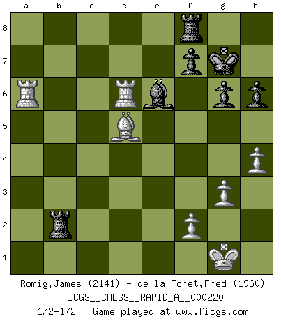 Last move : 1/2-1/2 2018 September 2 4:22:12 [Event "FICGS__CHESS__RAPID_A__000220"] [Site "FICGS"] [Date "2018.07.01"] [Round "1"] [White "Romig,James"] [Black "de la Foret,Fred"] [Result "1/2-1/2"] [WhiteElo "2141"] [BlackElo "1960"] 1.c4 Nf6 2.Nf3 e6 3.Nc3 Bb4 4.g3 O-O 5.Bg2 d5 6.d4 dxc4 7.O-O Nc6 8.Bg5 h6 9.Bxf6 Qxf6 10.e3 Rb8 11.Ne4 Qg6 12.Ned2 b5 13.a4 a6 14.axb5 axb5 15.Nh4 Qd3 16.Nxc4 bxc4 17.Bxc6 Qxd1 18.Rfxd1 Rb6 19.Bg2 c5 20.Nf3 cxd4 21.Nxd4 Be7 22.Rdc1 Rxb2 23.Rxc4 Bf6 24.Rc7 Be5 25.Rc5 Bxd4 26.exd4 Rd2 27.d5 exd5 28.Rxd5 Rb2 29.Rd6 g6 30.h4 Be6 31.R1a6 Kg7 32.Bd5 1/2-1/2 English Opening Kingside Castling by player Black (move 4) Kingside Castling by player White (move 7) This chess game ended in a draw. Follow this game move after move (download)The mistakes are there, waiting to be made. (Savielly Tartakower) Wer der Ansicht ist, daß alle Schachspieler verrückt sind, wird durch Studium des Lebens von Emil Josef Diemer nicht auf andere Gedanken kommen. (Hans Ree) El Ajedrez tiene tanto misterio como las mujeres. (Purdy) Les échecs, c'est l'art d'analyser. (Mikhail Botvinnik) They say in chess you've got to kill the queen, and then you mate it... Oh I, do you ? (Red Hot Chili Peppers, Fortune faded)