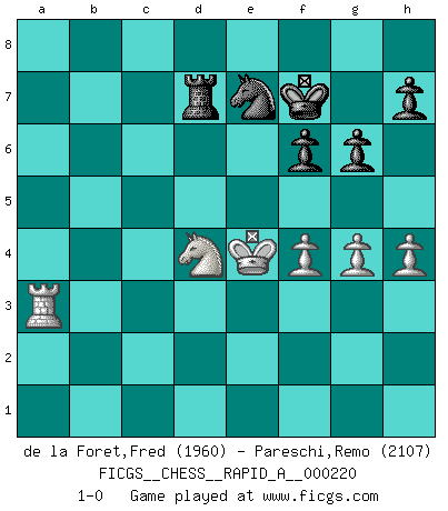 Last move : 1-0 2019 January 18 18:8:50 [Event "FICGS__CHESS__RAPID_A__000220"] [Site "FICGS"] [Date "2018.07.01"] [Round "1"] [White "de la Foret,Fred"] [Black "Pareschi,Remo"] [Result "1-0"] [WhiteElo "1960"] [BlackElo "2107"] 1.e4 e5 2.Nf3 Nc6 3.Bb5 a6 4.Bxc6 dxc6 5.O-O Bg4 6.d3 Qf6 7.Nbd2 Ne7 8.h3 Bh5 9.b4 c5 10.bxc5 Nc6 11.Ba3 Be7 12.Qc1 O-O 13.Re1 Qe6 14.Rb1 Rab8 15.c3 Rfd8 16.Re3 f6 17.Qb2 Qd7 18.Rbe1 Bf7 19.Qc1 b5 20.cxb6 Bxa3 21.Qxa3 cxb6 22.d4 exd4 23.Rd3 a5 24.Nxd4 Ne5 25.Rde3 Qc7 26.f4 Ng6 27.g3 b5 28.N4f3 b4 29.cxb4 axb4 30.Qb2 Qa7 31.Nb3 Ra8 32.Nc1 Rdc8 33.Kg2 Bxa2 34.Nxa2 Qxa2 35.R1e2 Qc4 36.Nd4 Ra3 37.Rc2 Rc3 38.Rexc3 bxc3 39.Qb7 Rc7 40.Qd5+ Qxd5 41.exd5 Rc5 42.d6 Kf7 43.Kf3 Rd5 44.Ne2 Rd3+ 45.Ke4 Rxd6 46.Rxc3 Rd7 47.Rd3 Rb7 48.Ra3 Ne7 49.Nd4 Rd7 50.g4 Nc8 51.Rc3 Ne7 52.Ra3 g6 53.h4 1-0 This chess game has been lost on time (started : 2018.07.01 18:18:57) Ruy Lopez : Exchange variation, 5.O-O Kingside Castling by player White (move 5) Kingside Castling by player Black (move 12) Player White won this chess game. Follow this game move after move (download)We cannot resist the fascination of sacrifice, since a passion for sacrifices is part of a Chessplayer's nature. (Rudolf Spielman) Schach ist das Spiel, das die Verrückten gesund hält. (Albert Einstein) Mi estilo es algo parecido entre un poco de Tal y Petrosian. (Reshevsky) Toute estimation doit être constamment réévaluée. (Jacob Estrin) Without enthusiasm, virtue functions not at all, and vice only poorly. (Mignon McLaughlin, The Neurotic's Notebook, 1960)