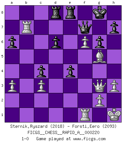 Last move : 1-0 2018 August 11 13:3:24 [Event "FICGS__CHESS__RAPID_A__000220"] [Site "FICGS"] [Date "2018.07.01"] [Round "1"] [White "Sternik,Ryszard"] [Black "Forsti,Eero"] [Result "1-0"] [WhiteElo "2018"] [BlackElo "2093"] 1.e4 e5 2.Nf3 Nc6 3.Bb5 a6 4.Ba4 Nf6 5.O-O Be7 6.Re1 b5 7.Bb3 d6 8.c3 O-O 9.h3 Nb8 10.d4 Nbd7 11.Nbd2 Bb7 12.Bc2 Re8 13.Nf1 Bf8 14.Ng3 g6 15.a4 c5 16.d5 c4 17.Bg5 Bg7 18.Qd2 Nc5 19.Nh2 Qc7 20.f4 bxa4 21.Rf1 a3 22.bxa3 Nfxe4 23.Nxe4 Nxe4 24.Bxe4 Qc5+ 25.Kh1 f5 26.Rab1 Rab8 27.fxe5 fxe4 28.Ng4 Qxd5 29.Qe3 Qc5 30.Qf4 Qd5 31.Nf6+ Bxf6 32.exf6 Qf7 33.Qg3 Rbd8 34.Rxb7 1-0 Ruy Lopez : Closed Kingside Castling by player White (move 5) Kingside Castling by player Black (move 8) Player White won this chess game. Follow this game move after move (download)It is always better to sacrifice your opponent's men. (Savielly Tartakower) Er war ein guter Schachspieler, aber ich kann Leute nicht ausstehen, die 'Heil Hitler' rufen (Über Alexander Aljechin). (Miguel Najdorf) Sin errores no puede haber brillantez. (Emanuel Lasker) Vous savez, camarade Pachman, je n'éprouve pas de plaisir à être ministre, je jouerais plutôt aux échecs comme vous, ou alors ferais une révolution au Venezuela. (Che Guevara à Ludek Pachman, 'Checkmate in Prague', 1975) God, you are such an idiot. - Actually, I thought I was more of a jerk. (Gregory House to Stacy Warner, House M.D.)