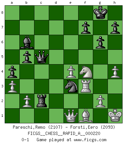 Last move : 0-1 2018 November 1 15:16:31 [Event "FICGS__CHESS__RAPID_A__000220"] [Site "FICGS"] [Date "2018.07.01"] [Round "1"] [White "Pareschi,Remo"] [Black "Forsti,Eero"] [Result "0-1"] [WhiteElo "2107"] [BlackElo "2093"] 1.d4 Nf6 2.c4 g6 3.Nc3 d5 4.Nf3 Bg7 5.Qb3 dxc4 6.Qxc4 O-O 7.e4 a6 8.Qa4 c5 9.dxc5 Bd7 10.Qb4 a5 11.Qc4 a4 12.Bd2 Be6 13.Qe2 Nbd7 14.Rd1 Nxc5 15.Ng5 Qc7 16.Nxe6 Nxe6 17.Qc4 Qb8 18.Be2 Rc8 19.Qb4 Qe5 20.a3 Nd4 21.Bd3 Rd8 22.h3 Bf8 23.O-O e6 24.Qc4 b5 25.Qa2 Bc5 26.f4 Qh5 27.Kh1 Ng4 28.Qb1 Nb3 29.Be1 Ne3 30.Be2 Qh6 31.Rxd8+ Rxd8 32.Rf3 Nd2 33.Bxd2 Rxd2 34.Qc1 Rc2 35.Qe1 e5 36.Nd5 exf4 37.Nxf4 Qg5 38.Bf1 Bb6 39.h4 Qc5 0-1 King's Indian defense, 3.Nc3 Kingside Castling by player Black (move 6) Kingside Castling by player White (move 23) Player Black won this chess game. Follow this game move after move (download)The older I grow, the more I value pawns. (Paul Keres) Es ist peinlich, dass ich nie Weltmeister wurde. Es wäre leicht, Leonid Breschnjew als Ursache vorzuschieben, dessen Apparat den Vorzeigekommunisten Anatoli Karpow in allem unterstützte. Aber Garri Kasparow zum Beispiel, der ebenfalls von den Sowjets unerwünscht war, hat trotz der Widerstände den WM-Titel erobert. (Viktor Kortschnoi) Yo no le temo a Spassky. Todos saben que yo soy el mejor. Uno no necesita un torneo para probarlo. (Bobby Fischer) Karpov est une pièce de musée. (Garry Kasparov) Luck is what you have left over after you give 100 percent. (Langston Coleman)