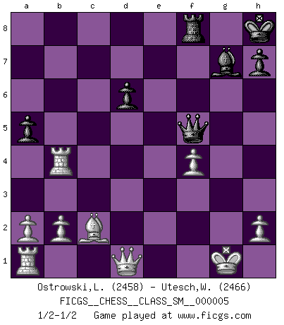 Last move : 1/2-1/2 2007 July 4 15:31:6 [Event "FICGS__CHESS__CLASS_SM__000005"] [Site "FICGS"] [Date "2007.05.11"] [Round "1"] [White "Ostrowski,Leszek"] [Black "Utesch,Wolfgang"] [Result "1/2-1/2"] [WhiteElo "2458"] [BlackElo "2466"] 1.e4 c5 2.Nf3 Nc6 3.d4 cxd4 4.Nxd4 Nf6 5.Nc3 e5 6.Ndb5 d6 7.Bg5 a6 8.Na3 b5 9.Bxf6 gxf6 10.Nd5 Bg7 11.Bd3 Ne7 12.Nxe7 Qxe7 13.O-O O-O 14.c3 f5 15.Nc2 Rb8 16.exf5 e4 17.Re1 Bxf5 18.Nb4 a5 19.Nd5 Qe5 20.Bc2 Bg6 21.g4 f5 22.f4 Qe6 23.Ne3 Kh8 24.gxf5 Bxf5 25.Nxf5 Qxf5 26.Rxe4 b4 27.cxb4 Rxb4 28.Rxb4 1/2-1/2 Sicilian : Pelikan (Lasker/Sveshnikov) variation Kingside Castling by player White (move 13) Kingside Castling by player Black (move 13) This chess game ended in a draw. Follow this game move after move (download)I have added these principles to the law: get the Knights into action before both Bishops are developed. (Emanuel Lasker) Im Schach gewinnt jeder. Hat man Freunde am Spiel - und das ist die Hauptsache - ist auch der Verlust einer Partie kein Unglück. (David Bronstein) En manos de Fischer's, una diminuta ventaja teórica es tan buena como tener una Reina de ventaja. (Isaac Kashdan) Le succès, c'est être capable d'aller d'échec en échec sans perdre son enthousiasme. (Winston Churchill) I teach you to lie, cheat and steal, and as soon as my back's turned you wait in line ? (Gregory House, House M.D.)