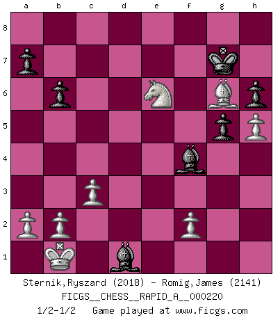 Last move : 1/2-1/2 2018 August 5 17:38:5 [Event "FICGS__CHESS__RAPID_A__000220"] [Site "FICGS"] [Date "2018.07.01"] [Round "1"] [White "Sternik,Ryszard"] [Black "Romig,James"] [Result "1/2-1/2"] [WhiteElo "2018"] [BlackElo "2141"] 1.e4 Nf6 2.e5 Nd5 3.d4 d6 4.Nf3 g6 5.Bc4 Nb6 6.Bb3 Bg7 7.Qe2 O-O 8.e6 d5 9.exf7+ Rxf7 10.Be3 Nc6 11.Nbd2 e5 12.dxe5 Nxe5 13.Nxe5 Bxe5 14.c3 c6 15.h4 Qf6 16.h5 g5 17.O-O-O h6 18.g4 Nd7 19.Rde1 b6 20.Rh3 Qg7 21.Nf3 Bd6 22.Ba4 Nf6 23.Bxc6 Bxg4 24.Bxa8 Bxh3 25.Bd4 Bf4+ 26.Kb1 Bg4 27.Bxf6 Rxf6 28.Qe8+ Rf8 29.Bxd5+ Kh8 30.Nd4 Qh7+ 31.Ka1 Rxe8 32.Rxe8+ Kg7 33.Be4 Qh8 34.Rxh8 Kxh8 35.Bg6 Bd1 36.Kb1 Kg7 37.Ne6+ 1/2-1/2 Alekhine's defense : Modern, Fianchetto variation Kingside Castling by player Black (move 7) Queenside Castling by player White (move 17) This chess game ended in a draw. Follow this game move after move (download)Daring ideas are like Chess men moved forward. They may be beaten, but they may start a winning game. (Johann Wolfgang von Goethe) Schach ist Kampf, hauptsächlich jedoch gegen die eigenen Fehler. (Savielly Grigorievitsch Tartakower) Sin errores no puede haber brillantez. (Emanuel Lasker) Mais n'est-ce pas déjà le limiter injurieusement que d'appeler les échecs un jeu? N'est-ce pas aussi une science, un art, ou quelque chose qui, comme le cercueil de Mahomet entre ciel et terre, est suspendu entre l'un et l'autre, et qui réunit un nombre incroyable de contraires ? (Stefan Zweig) Computer Science is no more about computers than astronomy is about telescopes. (Edsger W. Dijkstra)