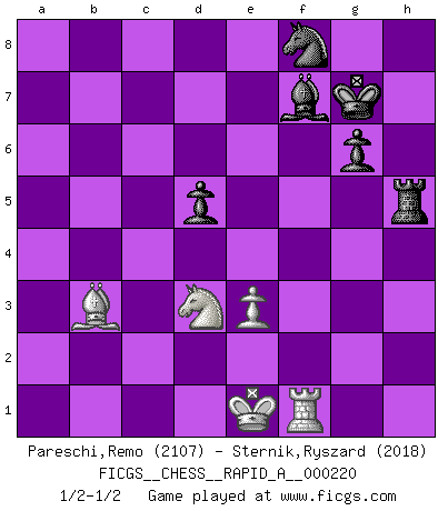 Last move : 1/2-1/2 2018 November 1 9:47:31 [Event "FICGS__CHESS__RAPID_A__000220"] [Site "FICGS"] [Date "2018.07.01"] [Round "1"] [White "Pareschi,Remo"] [Black "Sternik,Ryszard"] [Result "1/2-1/2"] [WhiteElo "2107"] [BlackElo "2018"] 1.d4 Nf6 2.c4 e6 3.Nc3 d5 4.cxd5 exd5 5.Bg5 c6 6.e3 Be7 7.Qc2 O-O 8.Bd3 Nbd7 9.Nf3 h6 10.Bh4 Re8 11.O-O-O Ne4 12.Bxe4 Bxh4 13.Bh7+ Kh8 14.Nxh4 Qxh4 15.g3 Qf6 16.Bd3 Nf8 17.h3 b5 18.g4 Bd7 19.Kb1 a5 20.Rhg1 a4 21.a3 Ne6 22.f4 b4 23.axb4 Qe7 24.g5 Qxb4 25.Rdf1 hxg5 26.fxg5 Reb8 27.Rxf7 a3 28.Na2 Qxb2+ 29.Qxb2 Rxb2+ 30.Ka1 Nf8 31.h4 Kg8 32.Re7 Rh2 33.Rf1 Rxh4 34.Nb4 Re8 35.Rxe8 Bxe8 36.Ka2 Rh3 37.Nc2 Rg3 38.Kxa3 Ne6 39.Kb4 Rxg5 40.Kc3 Rg3 41.Kd2 Rg2+ 42.Ke1 c5 43.Bf5 Bf7 44.dxc5 Nxc5 45.Nd4 g6 46.Bc2 Kg7 47.Rf3 Ne6 48.Ne2 Be8 49.Bb3 Rg5 50.Nf4 Bf7 51.Nd3 Rh5 52.Rf1 Nf8 1/2-1/2 Queen's pawn game Kingside Castling by player Black (move 7) Queenside Castling by player White (move 11) This chess game ended in a draw. Follow this game move after move (download)The hardest game to win is a won game. (Emanuel Lasker) Ich organisiere ein großes Turnier, was mich etwa 120000 Dollar kostet. Ich denke, das ist das erste Mal in der Schachgeschichte, daß ein Schachgroßmeister auch als Mäzen auftritt. (Miguel Najdorf) Yo no creo en la psicología. Yo creo en las buenas movidas. (Bobby Fischer) Echiquier : carré parfait, comme la Jérusalem nouvelle décrite par l'auteur de l'Apocalypse, huit cases sur huit, exaltation du chiffre 4, symbole du cosmos aux quatre horizons... où le noir et le blanc, l'ombre et la lumière, le mal et le bien s'entremêlent et se conjuguent. (Robert Couffignal, Le Gambit du poète) History is the quarrels of popes and kings, with wars or pestilences in every page; the men all so good for nothing, and hardly any women at all. (Jane Austen)