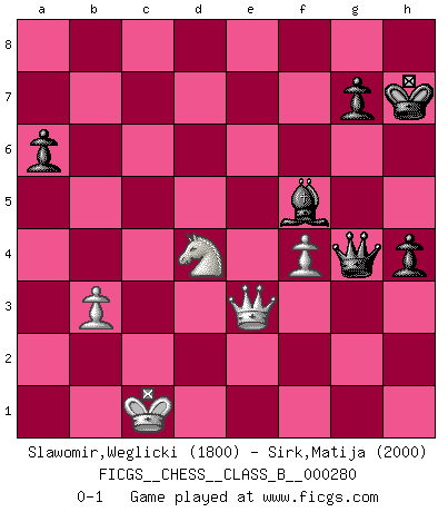 Last move : 0-1 2019 January 7 15:36:33 [Event "FICGS__CHESS__CLASS_B__000280"] [Site "FICGS"] [Date "2018.07.01"] [Round "1"] [White "Slawomir,Weglicki"] [Black "Sirk,Matija"] [Result "0-1"] [WhiteElo "1800"] [BlackElo "2000"] 1.e4 c5 2.Nc3 Nc6 3.Bb5 Nd4 4.Ba4 a6 5.Bb3 b5 6.d3 e6 7.Nf3 Nxb3 8.axb3 Bb7 9.O-O d6 10.Re1 Nf6 11.h3 Be7 12.Bg5 h6 13.Bh4 Rc8 14.Qe2 O-O 15.Nh2 Re8 16.Qd1 Kh7 17.Qe2 Nd5 18.Bxe7 Nxe7 19.f4 Ng6 20.Qf2 f5 21.exf5 exf5 22.Rxe8 Qxe8 23.Nf1 Qe7 24.Re1 Qf6 25.g3 Ne7 26.Nd1 Nc6 27.c3 Qf7 28.Nd2 Na5 29.Ne3 Nxb3 30.Nxb3 Qxb3 31.g4 Re8 32.gxf5 Qf7 33.Qh4 d5 34.Kf1 d4 35.cxd4 cxd4 36.Nc2 Rxe1+ 37.Kxe1 Qxf5 38.Qg3 Qd5 39.Kd2 b4 40.Qg1 Qf3 41.Qh2 Qf1 42.Qg3 Bd5 43.Nxb4 Bf3 44.Qe1 Qg2+ 45.Kc1 Qxh3 46.Nc2 Qf5 47.Qd2 Qg6 48.b3 h5 49.Kb2 Qg1 50.Qa5 h4 51.Qe5 Qg2 52.Kb1 Qh1+ 53.Ka2 Qg2 54.Kb1 Be2 55.Nxd4 Bxd3+ 56.Kc1 Qg4 57.Qe3 Bf5 0-1 Sicilian : Closed, 2...Nc6 Kingside Castling by player White (move 9) Kingside Castling by player Black (move 14) Player Black won this chess game. Follow this game move after move (download)When I asked Fischer why he had not played a certain move in our game, he replied: 'Well, you laughed when I wrote it down !' (Mikhail Tal) Alles was ich jemals tun will ist Schach spielen. (Robert James Fischer) Por la belleza de sus partidas, la claridad de su juego y lo brillante de sus ideas, Fischer se creó el mismo como un artista de la misma estatura como Brahms, Rembrandt y Shakespeare. (David Levy) Aidez vos pièces, elles vous aideront. (Paul Morphy) The beginning is the most important part of the work. (Plato)