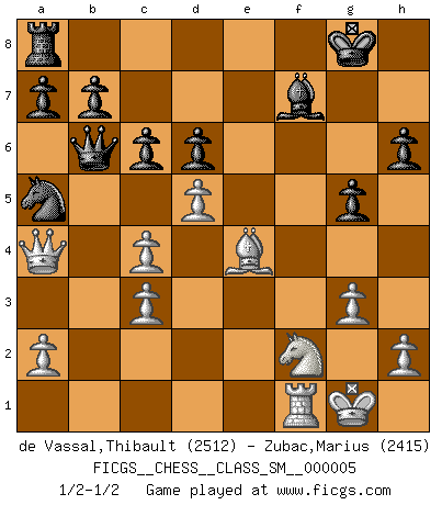 Last move : 1/2-1/2 2007 December 3 5:49:32 [Event "FICGS__CHESS__CLASS_SM__000005"] [Site "FICGS"] [Date "2007.05.11"] [Round "1"] [White "de Vassal,Thibault"] [Black "Zubac,Marius"] [Result "1/2-1/2"] [WhiteElo "2512"] [BlackElo "2415"] 1.c4 e5 2.Nc3 Bb4 3.g3 Bxc3 4.bxc3 d6 5.Bg2 f5 6.d4 Nf6 7.Rb1 e4 8.Nh3 O-O 9.O-O Nc6 10.f3 exf3 11.Bxf3 Na5 12.Qa4 c6 13.Bg5 h6 14.Bxf6 Rxf6 15.Nf4 Be6 16.d5 Bf7 17.e4 fxe4 18.Bxe4 g5 19.Nd3 Rxf1 20.Rxf1 Qc7 21.Nf2 Qb6 1/2-1/2 English, Kramnik-Shirov counterattack Kingside Castling by player Black (move 8) Kingside Castling by player White (move 9) This chess game ended in a draw. Follow this game move after move (download)Chess is a beautiful mistress. (Bent Larsen) Ein bischen Romantik kann weder im Schach noch in der Liebe schaden. Also versuche ich mich ab und zu daran zu erinnern. (Nigel Short) Yo nunca en mi vida he jugado la Defensa Francesa, que viene siendo la más aburrida de todas las Aperturas. (Wilhelm Steinitz) Fischer est le meilleur joueur du monde et Karpov n'est qu'un joueur de bistrot. (Garry Kasparov, agé de 16 ans) This is where the fun begins. (Anakin Skywalker in Star Wars ep.3)