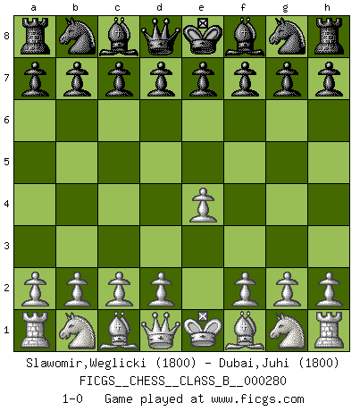 Last move : 1-0 2018 August 10 21:59:20 [Event "FICGS__CHESS__CLASS_B__000280"] [Site "FICGS"] [Date "2018.07.01"] [Round "1"] [White "Slawomir,Weglicki"] [Black "Dubai,Juhi"] [Result "1-0"] [WhiteElo "1800"] [BlackElo "1800"] 1.e4 1-0 This chess game has been lost on time (started : 2018.07.01 18:57:2) King's pawn Opening Player White won this chess game. Follow this game move after move (download)I give 98 percent of my mental energy to Chess. Others give only 2 percent. (Bobby Fischer) Wenn Du einsam bist, wenn Du Dich in der Welt wie ein Fremder fühlst, spiele Schach. Das wird Deinen Geist erheben und Dein Ratgeber im Kampf sein. (Aristoteles) El Ajedrez no es como la vida... ¡tiene reglas!. (Mark Pasternak) Les erreurs sont comme les malheurs, elles n'arrivent jamais seules. (Siegbert Tarrasch) They misunderestimated me. (George W. Bush, Bentonville nov. 6, 2000)