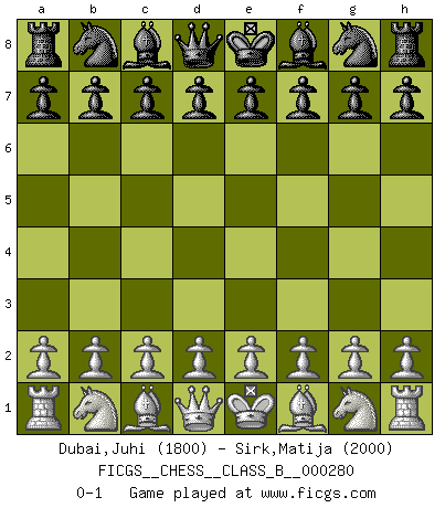 Last move : 0-1 2018 August 10 21:59:20 [Event "FICGS__CHESS__CLASS_B__000280"] [Site "FICGS"] [Date "2018.07.01"] [Round "1"] [White "Dubai,Juhi"] [Black "Sirk,Matija"] [Result "0-1"] [WhiteElo "1800"] [BlackElo "2000"] 0-1 This chess game has been lost on time (started : 2018.07.01 18:57:2) Player Black won this chess game. Follow this game move after move (download)It was clear to me that the vulnerable point of the American Grandmaster (Bobby Fischer) was in double-edged, hanging, irrational positions, where he often failed to find a win even in a won position. (Efim Geller) Wenn du auf das Glück wartest, wird das Leben ziemlich langweilig. (Mikhail Nekhemyevich Tal) Alguna parte de un error es siempre correcto. (Savielly Tartakover) Aux échecs, les retours au sommet sont rares : les dommages psychologiques consécutifs à une défaite sont trop sévères. (Daily Telegraph) Chess is everything: art, science and sport. (Anatoly Karpov)