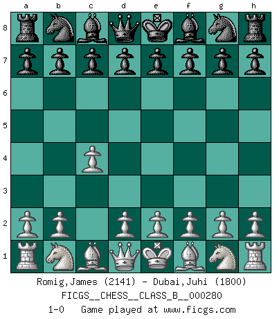 Last move : 1-0 2018 August 10 21:59:20 [Event "FICGS__CHESS__CLASS_B__000280"] [Site "FICGS"] [Date "2018.07.01"] [Round "1"] [White "Romig,James"] [Black "Dubai,Juhi"] [Result "1-0"] [WhiteElo "2141"] [BlackElo "1800"] 1.c4 1-0 This chess game has been lost on time (started : 2018.07.01 18:57:2) English Opening Player White won this chess game. Follow this game move after move (download)Play the opening like a book, the middle game like a magician, and the endgame like a machine. (Spielmann) Schach ist Krieg, im Schach geht es um testosterongesteuerte Urschreie. (Garry Kasparov) El Ajedrez es sobre todo, ¡una pelea!. (Emanuel Lasker) Il a essayé de se convaincre qu'il pourrait empêcher toutes les erreurs et ne jamais perdre. L'horreur ! Gary Kasparov au sujet de Robert Fischer. A married woman is like a fish riding a bicycle. (Rodolfo d'Ettorre)