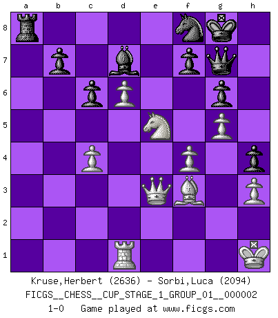 Last move : 1-0 2018 September 22 8:54:52 [Event "FICGS__CHESS__CUP_STAGE_1_GROUP_01__000002"] [Site "FICGS"] [Date "2018.07.02"] [Round "1"] [White "Kruse,Herbert"] [Black "Sorbi,Luca"] [Result "1-0"] [WhiteElo "2636"] [BlackElo "2094"] 1.Nf3 Nf6 2.g3 g6 3.c4 Bg7 4.d4 O-O 5.Bg2 d6 6.O-O Nbd7 7.Nc3 e5 8.e4 exd4 9.Nxd4 Re8 10.Qc2 c6 11.Rd1 Qe7 12.Bf4 a5 13.h3 Nc5 14.Re1 Nfd7 15.Be3 a4 16.Rad1 Nb6 17.b3 axb3 18.axb3 Ra3 19.Qc1 Ra6 20.Qc2 Ra3 21.f4 Bd7 22.Kh2 Rea8 23.Nde2 h5 24.Bd4 h4 25.g4 Bxd4 26.Nxd4 Qf6 27.Rf1 Qh8 28.Kh1 Be8 29.g5 Nbd7 30.Qb2 Nb6 31.Rfe1 Nbd7 32.Rf1 Nb6 33.Qf2 Nbd7 34.Qe3 Nf8 35.e5 Bd7 36.Nb1 Ra2 37.Nd2 Rb2 38.exd6 Re8 39.Qg1 Qg7 40.b4 Na4 41.Ne4 Rxe4 42.Bxe4 Nc3 43.Qe3 Nxd1 44.Rxd1 Rxb4 45.Nf3 Ra4 46.Ne5 Ra8 47.Bf3 1-0 Reti : King's Indian attack Kingside Castling by player Black (move 4) Kingside Castling by player White (move 6) Player White won this chess game. Follow this game move after move (download)Don't even mention losing to me. I can't stand to think of it. (Bobby Fischer) Ich glaube, ich kenne inzwischen die Gründe für mein Versagen: schachliche Charakterfehler. Ich war nie ein Wunderkind und in meiner gesamten menschlichen Entwicklung immer zu langsam. (Viktor Kortschnoi) El Ajedrez es de 30 a 40 por ciento psicología. Uno no cuenta con esto cuando se juega contra una computadora. No lo puedo confundir. (Judith Polgar) Le profane ne songe pas à la somme de jouissance dont il se prive, qui méconnaît ce jeu aux ressources aussi variées que passionnantes. (Jean-Marie Jeanton-Lamarche) He who defends everything defends nothing. (Frederick the Great)