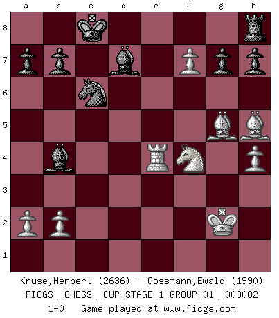 Last move : 1-0 2018 July 18 18:55:40 [Event "FICGS__CHESS__CUP_STAGE_1_GROUP_01__000002"] [Site "FICGS"] [Date "2018.07.02"] [Round "1"] [White "Kruse,Herbert"] [Black "Gossmann,Ewald"] [Result "1-0"] [WhiteElo "2636"] [BlackElo "1990"] 1.e4 c6 2.d4 d5 3.e5 Bf5 4.Nf3 e6 5.Be2 c5 6.c3 Nc6 7.O-O cxd4 8.Nxd4 Nxd4 9.cxd4 Ne7 10.g4 Bg6 11.f4 f5 12.exf6 Nc6 13.f5 exf5 14.Nc3 Qxf6 15.Nxd5 Qxd4+ 16.Be3 Qxd1 17.Raxd1 O-O-O 18.gxf5 Bf7 19.Bf3 Bd6 20.Bg5 Rd7 21.f6 Be6 22.Kh1 Re8 23.Bh5 Rg8 24.h4 Bf8 25.f7 Rh8 26.Nf4 Rxd1 27.Rxd1 Bd7 28.Kg2 Bc5 29.Re1 Bb4 30.Re4 1-0 Caro-Kann : Advance variation Kingside Castling by player White (move 7) Queenside Castling by player Black (move 17) Player White won this chess game. Follow this game move after move (download)At this time Fischer is simply a level above all the best Chessplayers in the world. (John Jacobs) Dass jemand wie Surab Asmaiparaschwili, der selbst Elopunkte gekauft hat , Vize-Präsident der Fide werden konnte, sagt schon einges über den Zustand dieser Organisation aus. (Joel Lautier) Una buena memoria, concentración, imaginación y una fuerte voluntad, se requiere para llegar a ser un buen jugador. (Bobby Fischer) Le système Elo représente seulement une moyenne. Il est simplement un indicateur de votre stabilité. (Anatoli Karpov) Perhaps chess is the wrong game for the times (The Chess Master and the Computer, by Garry Kasparov - 2010)