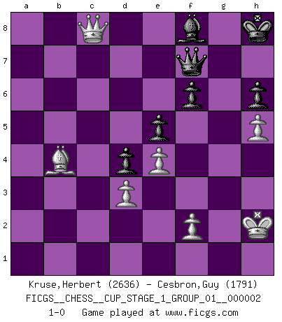 Last move : 1-0 2019 January 7 1:38:27 [Event "FICGS__CHESS__CUP_STAGE_1_GROUP_01__000002"] [Site "FICGS"] [Date "2018.07.02"] [Round "1"] [White "Kruse,Herbert"] [Black "Cesbron,Guy"] [Result "1-0"] [WhiteElo "2636"] [BlackElo "1791"] 1.Nf3 Nf6 2.g3 d5 3.Bg2 c6 4.O-O Bg4 5.d3 Nbd7 6.Nbd2 e5 7.h3 Bh5 8.Nh4 Bc5 9.c4 O-O 10.a3 a5 11.Rb1 Re8 12.b4 axb4 13.axb4 Bb6 14.Re1 Nf8 15.Qc2 Qd7 16.c5 Bc7 17.e4 Ne6 18.Ndf3 Ra7 19.Bd2 d4 20.Ra1 Rea8 21.Rxa7 Rxa7 22.Qb2 Qe8 23.g4 Bg6 24.Ra1 Qa8 25.Rxa7 Qxa7 26.Nf5 Qa6 27.Bf1 Bxf5 28.gxf5 Nf8 29.Be2 N8d7 30.Kg2 b6 31.cxb6 Bxb6 32.Qc1 Bd8 33.Bd1 h6 34.Bc2 Be7 35.Qb1 Ne8 36.Bb3 Nd6 37.Qc2 Bd8 38.Bc1 Be7 39.Bd2 Bd8 40.Ne1 Bc7 41.Ba2 Qb5 42.Nf3 Bd8 43.Qb3 Bc7 44.Qa3 Qb7 45.f6 gxf6 46.Nh4 Kh7 47.Qb3 c5 48.Qd1 Qa8 49.Bd5 Qg8+ 50.Kf1 cxb4 51.Qh5 Qg7 52.Nf5 Qg6 53.Qf3 b3 54.Bxb3 Nc5 55.Ba2 Ne6 56.Ne7 Qg7 57.h4 Bd8 58.Nf5 Nxf5 59.Qxf5+ Kh8 60.Bxe6 fxe6 61.Qxe6 Be7 62.h5 Bf8 63.Ke2 Kh7 64.Qf5+ Kh8 65.Qc8 Kh7 66.Kf3 Qf7 67.Qf5+ Kh8 68.Kg4 Qa2 69.Qc8 Qf7 70.Ba5 Qe7 71.Kh3 Qa3 72.Kh2 Qe7 73.Bd2 Qf7 74.Bb4 1-0 Reti Opening Kingside Castling by player White (move 4) Kingside Castling by player Black (move 9) Player White won this chess game. Follow this game move after move (download)Methodical thinking is of more use in Chess than inspiration. (C. J. S. Purdy) Ein Schachspiel besteht aus drei Phasen: Die erste, wenn du hofftst den Vorteil zu haben, die zweite, wenn du glaubst einen Vorteil zu haben, und die dritte.... wenn du weißt Du wirst verlieren. (Savielly Grigorievitsch Tartakower) a manera como él juega al Ajedrez, demuestra la completa naturaleza de un hombre. (Stanley Ellin) Je fais ceci parce que dans cinquante coups j'obtiendrai cela; je m'appelle Mikhail Moisevitch Botvinnik. (Botvinnik) Who needs drugs and alcohol if he can play Big Chess at FICGS ? (Heinz-Georg Lehnhoff)