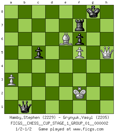 Last move : 1/2-1/2 2018 November 20 14:10:32 [Event "FICGS__CHESS__CUP_STAGE_1_GROUP_01__000002"] [Site "FICGS"] [Date "2018.07.02"] [Round "1"] [White "Hamby,Stephen"] [Black "Grynyuk,Vasyl"] [Result "1/2-1/2"] [WhiteElo "2229"] [BlackElo "2205"] 1.d4 d5 2.c4 c6 3.Nc3 Nf6 4.Nf3 e6 5.e3 Nbd7 6.Be2 Bd6 7.O-O O-O 8.b3 b6 9.Bb2 Bb7 10.Qc2 Re8 11.Rad1 Qe7 12.Rfe1 Bb4 13.h3 c5 14.a3 Ba5 15.Ne5 Nf8 16.dxc5 bxc5 17.Rc1 Rac8 18.Red1 Bc7 19.Nb1 Bb8 20.Nd2 Ng6 21.Nxg6 hxg6 22.Qc3 Red8 23.Nf1 Bd6 24.Bf3 Bc6 25.Ba1 Qc7 26.Rb1 a6 27.Bb2 Qb6 28.cxd5 exd5 29.Qc2 Qb7 30.Nd2 Nd7 31.Rbc1 Nf6 32.g3 Be7 33.Bg2 Bd7 34.Bc3 Bf5 35.Qb2 Qb6 36.g4 Be6 37.Be5 a5 38.Rb1 Bd7 39.g5 Nh5 40.Bxd5 Bxh3 41.Nc4 Qa6 42.e4 Bg4 43.f4 Bxd1 44.Rxd1 a4 45.Qc2 Ra8 46.bxa4 Qxa4 47.Qe2 Ra6 48.Kf2 Ra7 49.Rb1 Rf8 50.f5 Kh7 51.Rh1 Bxg5 52.Bd6 Re8 53.Kg2 Qd7 54.e5 Kg8 55.Rxh5 gxh5 56.e6 Qa4 57.exf7+ Rxf7 58.Ne5 Rxe5 59.Bxe5 Qd7 60.Be6 Qb7+ 61.Kg1 Bf6 62.Bxf6 gxf6 63.Qxh5 Qb1+ 64.Kf2 1/2-1/2 QGD Slav defense Kingside Castling by player White (move 7) Kingside Castling by player Black (move 7) 10 pieces endgame at move 63 : White KQBPP , Black KQRPP WHITE : King + 1 Queen 1 Bishop 2 Pawns BLACK : King + 1 Queen 1 Rook 2 Pawns This chess game ended in a draw. Follow this game move after move (download)Of Chess it has been said that life is not long enough for it, but that is the fault of life, not Chess. (William Ewart Napier) Ich verachte die Medien. (Robert James Fischer) En manos de Fischer's, una diminuta ventaja teórica es tan buena como tener una Reina de ventaja. (Isaac Kashdan) Le succès, c'est être capable d'aller d'échec en échec sans perdre son enthousiasme. (Winston Churchill) I teach you to lie, cheat and steal, and as soon as my back's turned you wait in line ? (Gregory House, House M.D.)
