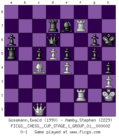 Last move : 0-1 2018 October 3 11:13:39 [Event "FICGS__CHESS__CUP_STAGE_1_GROUP_01__000002"] [Site "FICGS"] [Date "2018.07.02"] [Round "1"] [White "Gossmann,Ewald"] [Black "Hamby,Stephen"] [Result "0-1"] [WhiteElo "1990"] [BlackElo "2229"] 1.e4 c5 2.Nf3 d6 3.d4 cxd4 4.Nxd4 Nf6 5.Nc3 a6 6.f3 e5 7.Nb3 Be6 8.Be3 Be7 9.Be2 O-O 10.O-O Nbd7 11.a4 Qc7 12.Qd2 Rfd8 13.a5 b5 14.Nd5 Nxd5 15.exd5 Bf5 16.c3 Re8 17.Nc1 Nc5 18.Ra3 h6 19.c4 bxc4 20.Bxc4 Qb7 21.Bxc5 Rac8 22.Nb3 dxc5 23.Qe2 Ra8 24.Kh1 Bf8 25.Nd2 Qxb2 26.Ra2 Qb7 27.Rd1 Bd6 28.Ne4 Bxe4 29.fxe4 Reb8 30.g3 Qc7 31.Kg2 Rb4 32.Rc1 g6 33.Rf1 Kg7 34.h3 Ra7 35.Qd3 h5 36.Qc3 Qe7 37.Kh1 h4 38.g4 Qd8 39.Kg2 Kg8 40.Rf3 Be7 41.Rc2 Qd6 42.Qd2 Kg7 43.Qc1 Ra4 44.Rb2 Rxa5 45.Rbf2 f6 46.g5 fxg5 47.Rf7+ Kh6 48.Kh2 Rd7 0-1 Sicilian : Najdorf Kingside Castling by player Black (move 9) Kingside Castling by player White (move 10) Player Black won this chess game. Follow this game move after move (download)In life, as in Chess, one's own Pawns block one's way. A man's very wealth, ease, leisure, children, books, which should help him to win, more often checkmate him. (Charles Buxton) Der Partner hat auch seine Existenzberechtigung. (Savielly Grigorievitsch Tartakower) Alguna parte de un error es siempre correcto. (Savielly Tartakover) Avec des compensations pour le matériel en plus... (Anonyme) Locking firmely the window serves nothing, only small thiefs pass through there, the big thiefs enter through the front door. (Luc-Olivier Leclerc)