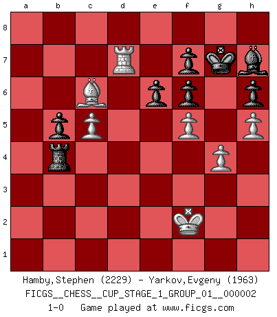 Last move : 1-0 2018 November 22 10:46:36 [Event "FICGS__CHESS__CUP_STAGE_1_GROUP_01__000002"] [Site "FICGS"] [Date "2018.07.02"] [Round "1"] [White "Hamby,Stephen"] [Black "Yarkov,Evgeny"] [Result "1-0"] [WhiteElo "2229"] [BlackElo "1963"] 1.Nf3 d5 2.g3 c6 3.Bg2 Nf6 4.O-O Bf5 5.d3 e6 6.Nbd2 h6 7.b3 Be7 8.Bb2 O-O 9.Re1 Nbd7 10.e4 dxe4 11.dxe4 Bg6 12.Qe2 Qc7 13.Nd4 Rad8 14.e5 Nd5 15.a3 Nc5 16.h4 a6 17.Rad1 Rd7 18.Nc4 b5 19.Nd6 Bxd6 20.exd6 Rxd6 21.h5 Bh7 22.c4 Nf6 23.b4 Nce4 24.c5 Rd5 25.Nb3 Re8 26.Nd2 Rxd2 27.Rxd2 Nxd2 28.Bxf6 gxf6 29.Qxd2 Kg7 30.Rd1 Rc8 31.g4 a5 32.f4 axb4 33.axb4 Qe7 34.Qd6 Qc7 35.Qxc7 Rxc7 36.Rd6 Ra7 37.Bxc6 Ra1+ 38.Kf2 Rb1 39.f5 Rxb4 40.Rd7 1-0 Reti : King's Indian attack (Barcza system) Kingside Castling by player White (move 4) Kingside Castling by player Black (move 8) Player White won this chess game. Follow this game move after move (download)Chess teaches you to control the initial excitement you feel when you see something that looks good and it trains you to think objectively when you're in trouble. (Stanley Kubrick) Capablanka war das größte Genie der Schachgeschichte! Aber denken sie nicht er habe nichts vom Schach verstanden. Er wusste nur soviel wie er wissen musste um seine Ziele zu erreichen. (Mikhail Moiseyevich Botvinik) Yo he agregado estos principios a la ley: pongan los Caballos en acción antes de que los dos Alfiles sean desarrollados. (Emanuel Lasker) Roi des jeux et jeu des rois, les échecs portent en eux un sentiment d'infini. Ils donnent à celui qui s'est efforcé d'en approfondir les arcanes l'impression de n'être pas à la mesure de l'homme; en fait, ils constituent un résumé de l'univers, un microcosme, et figurent cette grande échelle qui, dans les plans de la lumière descend jusqu'à la matière, qui des abîmes insondables remonte jusqu'en l'infini de Dieu. (Pyrame) Sometimes it pays to stay in bed in Monday, rather than spending the rest of the week debugging Monday's code. (Dan Salomon)