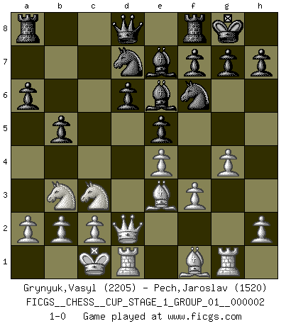 Last move : 1-0 2018 August 17 4:48:40 [Event "FICGS__CHESS__CUP_STAGE_1_GROUP_01__000002"] [Site "FICGS"] [Date "2018.07.02"] [Round "1"] [White "Grynyuk,Vasyl"] [Black "Pech,Jaroslav"] [Result "1-0"] [WhiteElo "2205"] [BlackElo "1520"] 1.e4 c5 2.Nf3 d6 3.d4 cxd4 4.Nxd4 Nf6 5.Nc3 a6 6.Be3 e5 7.Nb3 Be6 8.f3 Be7 9.Qd2 O-O 10.O-O-O Nbd7 11.g4 b5 12.Rg1 1-0 Sicilian : Najdorf, Byrne (English) attack Kingside Castling by player Black (move 9) Queenside Castling by player White (move 10) Player White won this chess game. Follow this game move after move (download)Kasparov : J'adoube , Ivanchuk : S'il vous plaît ! (Garry Kasparov & Vassily Ivanchuk, Linares 1997) Es hat in meinem Leben Zeiten gegeben, da ich sehr nahe daran war zu glauben, daß ich auch nicht eine einzige Schachpartie verlieren könnte. (José Raúl Capablanca) En manos de Fischer's, una diminuta ventaja teórica es tan buena como tener una Reina de ventaja. (Isaac Kashdan) Il vaut toujours mieux jouer un plan faux de façon logique que de n'avoir pas de plan du tout. (Victor Kortchnoï) A cynic is a man who knows the price of everything but the value of nothing. (Oscar Wilde)