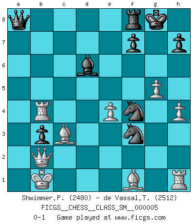 Last move : 0-1 2007 August 12 11:52:49 [Event "FICGS__CHESS__CLASS_SM__000005"] [Site "FICGS"] [Date "2007.05.11"] [Round "1"] [White "Shwimmer,Peter"] [Black "de Vassal,Thibault"] [Result "0-1"] [WhiteElo "2480"] [BlackElo "2512"] 1.Nc3 c5 2.Nf3 Nf6 3.e4 d6 4.d4 cxd4 5.Nxd4 a6 6.Be3 e5 7.Nb3 Be6 8.f3 Be7 9.Qd2 O-O 10.O-O-O Nbd7 11.g4 b5 12.g5 b4 13.Ne2 Ne8 14.f4 a5 15.f5 a4 16.Nbd4 exd4 17.Nxd4 b3 18.Kb1 bxc2 19.Nxc2 Bb3 20.axb3 axb3 21.Na3 Ne5 22.h4 Ra4 23.Bd4 Qa8 24.Qg2 Nc7 25.f6 Bd8 26.fxg7 Kxg7 27.Bc3 Kg8 28.Rd4 Rxa3 29.bxa3 Ne6 30.Rxd6 Nf4 31.Qd2 Bc7 32.Rd4 Nf3 33.Qf2 Qxa3 34.Qb2 Qa8 35.Rb4 Bd6 0-1 Comment by player 2 : Thibault de Vassal : Thanks for the game ! Best wishes, Thibault Dunst (Sleipner, Heinrichsen) Opening Kingside Castling by player Black (move 9) Queenside Castling by player White (move 10) Player Black won this chess game. Follow this game move after move (download)Chess is a terrible game. If you have no center, your opponent has a freer position. If you do have a center, then you really have something to worry about ! (Siegbert Tarrasch) Rubinstein ist ein Turmendspiel, welches die Götter vor tausenden von Jahren begannen. (Savielly Grigorievitsch Tartakower) Nada excita más a Grandes Maestros aburridos que una novedad teórica. (Dominic Lawson) Vous n'êtes pas toujours obligé de jouer le meilleur coup. Un coup doit être actif, entreprenant, correct et beau ! (David Bronstein) Now the reason the enlightened prince and the wise general conquer the enemy whenever they move and their achievements surpass those of ordinary men is foreknowledge. (Sun Tzu)