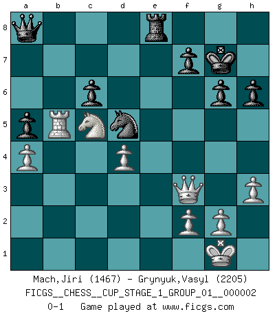 Last move : 0-1 2018 September 22 15:3:58 [Event "FICGS__CHESS__CUP_STAGE_1_GROUP_01__000002"] [Site "FICGS"] [Date "2018.07.02"] [Round "1"] [White "Mach,Jiri"] [Black "Grynyuk,Vasyl"] [Result "0-1"] [WhiteElo "1467"] [BlackElo "2205"] 1.e4 e5 2.Nf3 Nc6 3.Bb5 a6 4.Ba4 Nf6 5.O-O Be7 6.Re1 b5 7.Bb3 d6 8.c3 O-O 9.h3 Nb8 10.d4 Nbd7 11.Nbd2 Bb7 12.Bc2 Re8 13.Nf1 Bf8 14.Ng3 g6 15.Bg5 h6 16.Bd2 Bg7 17.a4 Nb6 18.b3 bxa4 19.bxa4 a5 20.Bd3 Nfd7 21.Rb1 Ba6 22.Bxa6 Rxa6 23.Be3 Qa8 24.Nd2 d5 25.dxe5 Nxe5 26.Bd4 dxe4 27.Rxe4 Nd5 28.Nf3 Nxf3+ 29.Qxf3 Rxe4 30.Nxe4 Bxd4 31.cxd4 Rc6 32.Rb5 Kg7 33.Qg3 Re6 34.Nc5 Re8 35.Qf3 c6 0-1 This chess game has been lost on time (started : 2018.07.02 2:46:7) Ruy Lopez : Closed Kingside Castling by player White (move 5) Kingside Castling by player Black (move 8) Player Black won this chess game. Follow this game move after move (download)Chess books should be used as we use glasses: to assist the sight, although some players make use of them as if they thought they conferred sight. (Jose Raul Capablanca) Gegen einen Schachcomputer zu verlieren ist wie Löcher in den Strümpfen zuhaben. Es ist nicht peinlich, solange man der einzige ist der es weiß. (Anonymous) La pasion por jugar al Ajedrez es una de las mas inexplicables en el mundo. (H.G. Wells) Je fais ceci parce que dans cinquante coups j'obtiendrai cela; je m'appelle Mikhail Moisevitch Botvinnik. (Botvinnik) I live to kill Traxler counterattack. (Ilmars Cirulis)
