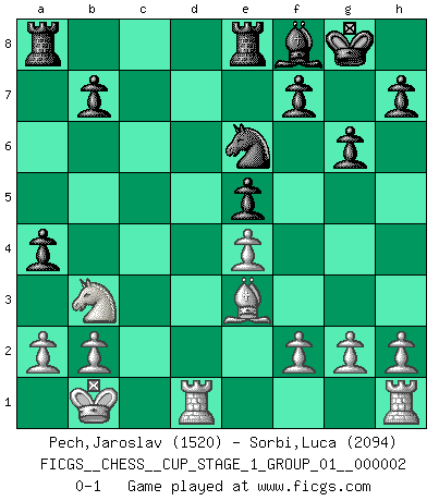 Last move : 0-1 2018 September 22 15:3:58 [Event "FICGS__CHESS__CUP_STAGE_1_GROUP_01__000002"] [Site "FICGS"] [Date "2018.07.02"] [Round "1"] [White "Pech,Jaroslav"] [Black "Sorbi,Luca"] [Result "0-1"] [WhiteElo "1520"] [BlackElo "2094"] 1.c4 Nf6 2.Nc3 g6 3.d4 Bg7 4.e4 d6 5.Nf3 O-O 6.Be2 e5 7.dxe5 dxe5 8.Qxd8 Rxd8 9.Bg5 Re8 10.Nd5 Nxd5 11.cxd5 c6 12.Bc4 cxd5 13.Bxd5 Nd7 14.Nd2 Nc5 15.O-O-O Be6 16.Bxe6 Nxe6 17.Be3 Bf8 18.Nb3 a5 19.Kb1 a4 0-1 This chess game has been lost on time (started : 2018.07.02 2:46:7) English Opening Kingside Castling by player Black (move 5) Queenside Castling by player White (move 15) Player Black won this chess game. Follow this game move after move (download)The older I grow, the more I value pawns. (Paul Keres) Ich glaube, ich kenne inzwischen die Gründe für mein Versagen: schachliche Charakterfehler. Ich war nie ein Wunderkind und in meiner gesamten menschlichen Entwicklung immer zu langsam. (Viktor Kortschnoi) En el tablero, la mentira e hipocresía no sobreviven mucho. (Emanuel Lasker) Fischer est le meilleur joueur du monde et Karpov n'est qu'un joueur de bistrot. (Garry Kasparov, agé de 16 ans) You must do what you feel is right... of course. (Obi-Wan Kenobi in Star Wars ep.4)
