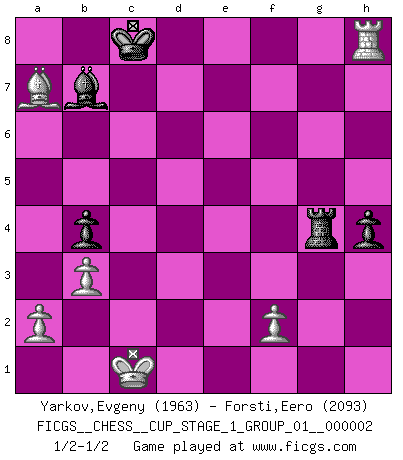 Last move : 1/2-1/2 2018 October 19 7:50:36 [Event "FICGS__CHESS__CUP_STAGE_1_GROUP_01__000002"] [Site "FICGS"] [Date "2018.07.02"] [Round "1"] [White "Yarkov,Evgeny"] [Black "Forsti,Eero"] [Result "1/2-1/2"] [WhiteElo "1963"] [BlackElo "2093"] 1.e4 e5 2.Nf3 Nc6 3.d4 exd4 4.Nxd4 Nf6 5.Nxc6 bxc6 6.e5 Qe7 7.Qe2 Nd5 8.c4 Nb6 9.Nc3 Qe6 10.Qe4 Bb4 11.Bd2 Ba6 12.b3 Bxc3 13.Bxc3 d5 14.Qh4 dxc4 15.Be2 Nd5 16.Bxc4 g5 17.Bxd5 Qxd5 18.Qa4 Qb5 19.Qxb5 cxb5 20.e6 Rg8 21.h4 fxe6 22.O-O-O h5 23.Rhe1 Ke7 24.Bb4+ Kf6 25.Rd7 Rae8 26.Bc3+ e5 27.Rxc7 gxh4 28.Rc6+ Re6 29.Rxe6+ Kxe6 30.Rxe5+ Kf7 31.Rf5+ Ke7 32.Re5+ Kf7 33.Rf5+ Ke7 34.Bb4+ Ke8 35.Rxh5 Rxg2 36.Rh8+ Kd7 37.Bc5 Rg4 38.Rh7+ Kc8 39.Bxa7 Bb7 40.Rh5 b4 41.Rh8+ Kd7 42.Rh7+ Kc8 43.Rh8+ 1/2-1/2 Scotch : Mieses variation Queenside Castling by player White (move 22) This chess game ended in a draw. Follow this game move after move (download)What is the object of playing a gambit opening?... To acquire a reputation of being a dashing player at the cost of losing a game. (Siegbert Tarrasch) Irgendwie scheint mir sonntags früh um 9 Uhr der Killerinstinkt verloren gegangen zu sein. (Alexej Shirov) Un Peón pasado aumenta su poder a medida de que el número de piezas en el tablero disminuye. (Capablanca) Tout change constamment, y compris dans le monde des Echecs. (Botvinnik) Nothing is more important for teaching us to understand the concepts we have than constructing fictitious ones. (Ludwig Wittgenstein)