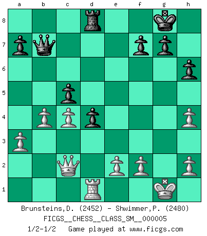 Last move : 1/2-1/2 2007 September 18 11:0:40 [Event "FICGS__CHESS__CLASS_SM__000005"] [Site "FICGS"] [Date "2007.05.11"] [Round "1"] [White "Brunsteins,Daniel"] [Black "Shwimmer,Peter"] [Result "1/2-1/2"] [WhiteElo "2452"] [BlackElo "2480"] 1.d4 Nf6 2.c4 e6 3.Nf3 b6 4.g3 Ba6 5.Qa4 Bb7 6.Bg2 c5 7.dxc5 bxc5 8.O-O Be7 9.Nc3 O-O 10.Rd1 Qb6 11.Bf4 d6 12.Rab1 Na6 13.a3 Bc6 14.Qc2 Rfd8 15.Rd2 h6 16.Rbd1 e5 17.Be3 Qb7 18.Nb5 Ne8 19.Ne1 Bxg2 20.Nxg2 Nac7 21.Nxc7 Nxc7 22.Nh4 Bxh4 23.gxh4 Ne6 24.Rxd6 Nd4 25.Rxd8+ Rxd8 26.Bxd4 exd4 27.b4 1/2-1/2 Queen's Indian : Nimzovich variation (exaggerated Fianchetto) Kingside Castling by player White (move 8) Kingside Castling by player Black (move 9) This chess game ended in a draw. Follow this game move after move (download)Every Chess master was once a beginner. (Chernev) Kostenjuk hat keinen Sexappeal. (Loek van Wely) Puntos débiles o agujeros en la posición de tu oponente deben de ser ocupados por piezas, no Peones. (Siegbert Tarrasch) La conception d'un plan est le processus par lequel un joueur exploite les avantages de sa position tout en s'efforçant d'en réduire au minimum les inconvénients. Afin de garantir le succès, un plan doit toujours se fonder sur un diagnostic objectif des particularités d'une position. La conception d'un plan est d'autant plus difficile que la position est équilibrée, et grandement facilitée lorsqu'il n'existe qu'un seul plan susceptible de répondre aux exigences de la position. (Harry Golombek) Hardware: the parts of a computer that can be kicked. (Jeff Persis)