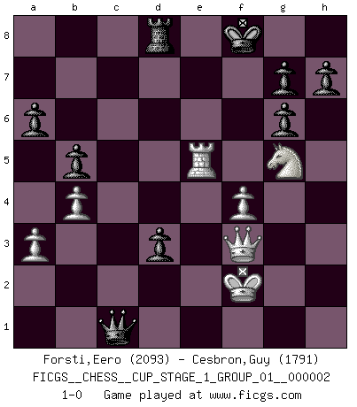 Last move : 1-0 2018 October 11 2:14:59 [Event "FICGS__CHESS__CUP_STAGE_1_GROUP_01__000002"] [Site "FICGS"] [Date "2018.07.02"] [Round "1"] [White "Forsti,Eero"] [Black "Cesbron,Guy"] [Result "1-0"] [WhiteElo "2093"] [BlackElo "1791"] 1.d4 Nf6 2.c4 e6 3.Nc3 d5 4.cxd5 exd5 5.Bg5 Be7 6.e3 c6 7.Bd3 Nbd7 8.Nf3 O-O 9.Qc2 Re8 10.O-O Nf8 11.h3 Be6 12.Rae1 Ng6 13.Rc1 Qd6 14.a3 Bd7 15.Rfe1 Bd8 16.Bxf6 Bxf6 17.e4 Qf4 18.exd5 Bxh3 19.Ne2 Qg4 20.Ng3 Bxg2 21.Nh2 Qxd4 22.Bxg6 fxg6 23.Kxg2 cxd5 24.Nf3 Qb6 25.b4 Rxe1 26.Rxe1 Rd8 27.Qa4 a6 28.Re8+ Kf7 29.Ne5+ Bxe5 30.Rxe5 Qd6 31.f4 Qc6 32.Qb3 Kf8 33.Qd3 d4 34.Kf2 b5 35.Ne4 Qc1 36.Qf3 d3 37.Ng5 1-0 Queen's pawn game Kingside Castling by player Black (move 8) Kingside Castling by player White (move 10) Player White won this chess game. Follow this game move after move (download)Of all my Russian books, the defense contains and diffuses the greatest 'warmth' which may seem odd seeing how supremely abstract Chess is supposed to be. (Vladimir Nabokov) Gewinnen beim Schach fördert das Selbstvertrauen. Beim Sex spüre ich sowas nicht... (Garry Kasparov) La caracteristica mas importante en la posición del Ajedrez es la actividad de las piezas. Esto es absolutamente fundamental en todas las fases del juego: Apertura, Juego Medio y especialmente Finales. La limitación primordial en la actividad de una pieza, es la estructuración de los Peones. (Michael Stean) La conception d'un plan est le processus par lequel un joueur exploite les avantages de sa position tout en s'efforçant d'en réduire au minimum les inconvénients. Afin de garantir le succès, un plan doit toujours se fonder sur un diagnostic objectif des particularités d'une position. La conception d'un plan est d'autant plus difficile que la position est équilibrée, et grandement facilitée lorsqu'il n'existe qu'un seul plan susceptible de répondre aux exigences de la position. (Harry Golombek) Creativity involves breaking out of established patterns in order to look at things in a different way. (Edward De Bono)