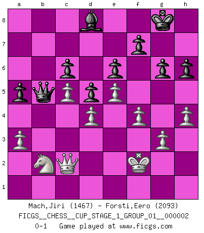 Last move : 0-1 2018 November 4 21:48:12 [Event "FICGS__CHESS__CUP_STAGE_1_GROUP_01__000002"] [Site "FICGS"] [Date "2018.07.02"] [Round "1"] [White "Mach,Jiri"] [Black "Forsti,Eero"] [Result "0-1"] [WhiteElo "1467"] [BlackElo "2093"] 1.d4 d5 2.c4 e6 3.Nc3 Be7 4.Nf3 Nf6 5.Bf4 O-O 6.e3 Nbd7 7.c5 Nh5 8.Bd3 Nxf4 9.exf4 b6 10.b4 a5 11.a3 c6 12.O-O Qc7 13.g3 Ba6 14.Bxa6 Rxa6 15.Qe2 R6a8 16.Rfb1 g6 17.Kg2 Rfb8 18.Ne5 Nxe5 19.fxe5 bxc5 20.bxc5 Qa7 21.h4 Rxb1 22.Rxb1 Rb8 23.Rxb8+ Qxb8 24.Qc2 Bd8 25.Qa4 Qb7 26.Nd1 Kg7 27.f3 Kf8 28.Qc2 Qb5 29.Nb2 Kg7 30.Kf2 Kf8 31.f4 Kg8 32.Na4 Kg7 33.Kg2 h6 34.Kf2 Kf8 35.Nb2 Kg8 0-1 This chess game has been lost on time (started : 2018.07.02 2:46:7) QGD : Charousek (Petrosian) variation Kingside Castling by player Black (move 5) Kingside Castling by player White (move 12) Player Black won this chess game. Follow this game move after move (download)An attack on the wing should be met by play in the center. (Nimzovitch) Der Schachmeister von Heute braucht Courage, einen Killerinstinkt, Ausdauer und Arroganz. (Larry Evans) Ciertamente, de todas la drogas del mundo, el Ajedrez debe ser el mas placentero permamentemente. (Assiac) Les Echecs sont affaire de jugement sensible. Savoir quand frapper et quand esquiver. (Fischer) God is an atheist. (Unknown)
