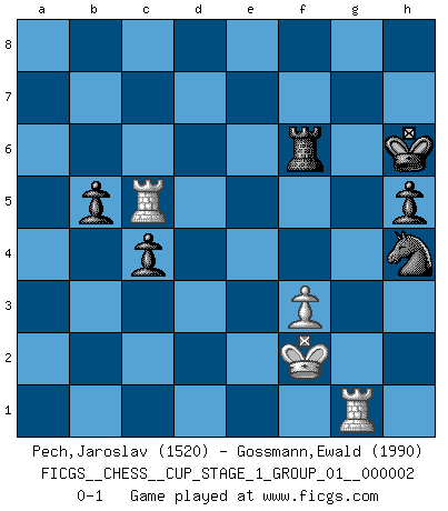 Last move : 0-1 2018 September 22 15:3:58 [Event "FICGS__CHESS__CUP_STAGE_1_GROUP_01__000002"] [Site "FICGS"] [Date "2018.07.02"] [Round "1"] [White "Pech,Jaroslav"] [Black "Gossmann,Ewald"] [Result "0-1"] [WhiteElo "1520"] [BlackElo "1990"] 1.e4 e6 2.d4 d5 3.Nc3 Bb4 4.e5 c5 5.a3 Bxc3+ 6.bxc3 Ne7 7.Qg4 O-O 8.Bd3 f5 9.exf6 Rxf6 10.Bg5 Rf7 11.Qh5 g6 12.Qd1 Qa5 13.Bd2 Nbc6 14.Nf3 c4 15.Be2 Nf5 16.h4 h6 17.O-O Bd7 18.Re1 Raf8 19.Qc1 b5 20.Rb1 a6 21.Bf4 Nfxd4 22.Bxh6 Qxc3 23.Bxf8 Rxf8 24.Bd1 Kg7 25.Qe3 Nxf3+ 26.Bxf3 Qxc2 27.Bg4 d4 28.Qg3 d3 29.h5 d2 30.Red1 Rf6 31.Qd6 Be8 32.Qxd2 Qxd2 33.Rxd2 gxh5 34.Bf3 Ne5 35.Be4 Bc6 36.Bxc6 Nxc6 37.Rd7+ Kg6 38.f3 e5 39.Kf2 e4 40.Rd5 exf3 41.gxf3 Ne7 42.Rg1+ Kh6 43.Rc5 Ng6 44.a4 Nh4 45.axb5 axb5 0-1 This chess game has been lost on time (started : 2018.07.02 2:46:7) French : Winawer, Advance, poisoned pawn variation Kingside Castling by player Black (move 7) Kingside Castling by player White (move 17) 10 pieces endgame at move 45 : White KRRP , Black KRNPPP WHITE : King + 2 Rooks 1 Pawn BLACK : King + 1 Rook 1 Knight 3 Pawns Player Black won this chess game. Follow this game move after move (download)Bobby Fischer is the greatest Chess player who has ever lived. (Ken Smith) Wenn Du nicht kämpfst, um anderen etwas zu beweisen, sondern nur für Dich selbst, dann bist du fast unbesiegbar. (Garry Kasparov) Para mi, el Ajedrez es la vida y cada partida es como una nueva vida. Todo jugador de Ajedrez suele vivir muchas vidas durante su vida. (Eduard Gufeld) Les Cavaliers se révèlent fort utiles dans les positions fermées. D'habitude, les Fous sont un peu plus forts que les Cavaliers dans les positions ouvertes. Qu'on le veuille ou non, il restera toujours des exceptions ! Luck is when opportunity knocks and you answer. (Anonymous)