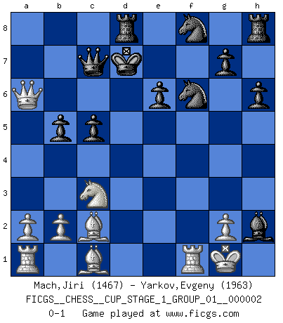 Last move : 0-1 2018 August 31 20:32:56 [Event "FICGS__CHESS__CUP_STAGE_1_GROUP_01__000002"] [Site "FICGS"] [Date "2018.07.02"] [Round "1"] [White "Mach,Jiri"] [Black "Yarkov,Evgeny"] [Result "0-1"] [WhiteElo "1467"] [BlackElo "1963"] 1.d4 d5 2.c4 c6 3.Nf3 Nf6 4.Nc3 e6 5.e3 Nbd7 6.Bd3 dxc4 7.Bxc4 b5 8.Bd3 Bb7 9.O-O a6 10.e4 c5 11.d5 Qc7 12.dxe6 fxe6 13.Bc2 Bd6 14.Ng5 Nf8 15.f4 O-O-O 16.Qe2 h6 17.Nf3 Bxf4 18.e5 Bxf3 19.Qxf3 Bxe5 20.Qa8+ Kd7 21.Qxa6 Bxh2+ 0-1 QGD Slav : 4.Nc3 Kingside Castling by player White (move 9) Queenside Castling by player Black (move 15) Player Black won this chess game. Follow this game move after move (download)One of these modest little moves may be more embarrassing to your opponent than the biggest threat. (Siegbert Tarrasch) Wie ich sie so einen nach dem anderen nieder mähte wurde meine Überlegenheit offensichtlich. (José Raúl Capablanca) El Ajedrez es una hermosa aventura. (Bent Larsen) En blitz, le Cavalier l'emporte sur le Fou. (Vlastimil Hort) Success without honor is an unseasoned dish; it will satisfy your hunger, but it won't taste good. (Joe Paterno)