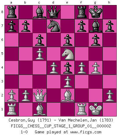 Last move : 1-0 2018 August 7 12:17:45 [Event "FICGS__CHESS__CUP_STAGE_1_GROUP_01__000002"] [Site "FICGS"] [Date "2018.07.02"] [Round "1"] [White "Cesbron,Guy"] [Black "Van Mechelen,Jan"] [Result "1-0"] [WhiteElo "1791"] [BlackElo "1783"] 1.f4 Nh6 2.Nf3 d5 3.e3 g6 4.Be2 Bg7 5.O-O Nf5 6.d4 O-O 7.c4 c6 8.Nc3 e6 9.g4 Nd6 10.c5 Ne4 11.Nxe4 dxe4 12.Ne5 Nd7 13.Qc2 1-0 Bird's Opening Kingside Castling by player White (move 5) Kingside Castling by player Black (move 6) Player White won this chess game. Follow this game move after move (download)The tactician must know what to do whenever something needs doing; the strategist must know what to do when nothing needs doing. (Savielly Tartakover) Sie führen leise Selbstgespräche, schlürfen lautstark ihre Getränke, schmatzen hörbar beim Essen, blasen ihrem Gegenüber Rauch in die Augen, niesen ihm ins Gesicht, starren ihn unverwandt an, bis er sich unter ihren Blicken windet, rutschen ständig auf ihrem Stuhl hin und her, rülpsen und bohren in der Nase. (Anonymous) La belleza de un movimiento no se refleja solo en su apariencia, sino en el pensamiento detrás de él. (Siegbert Tarrasch) Je ne suis pas le dernier à jouer lâchement des coups douteux pendant le zeïtnot de l'adversaire pour l'achever: en effet les coups qui font le plus peur sont ceux que l'on ne comprend pas. Je me fais souvent peur quand je joue. (Un professeur anonyme) Life is painting a picture, not doing a sum. (Oliver Wendell Holmes, Jr.)