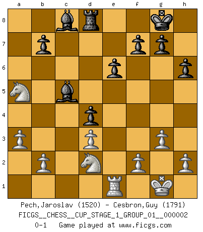 Last move : 0-1 2018 September 18 13:43:36 [Event "FICGS__CHESS__CUP_STAGE_1_GROUP_01__000002"] [Site "FICGS"] [Date "2018.07.02"] [Round "1"] [White "Pech,Jaroslav"] [Black "Cesbron,Guy"] [Result "0-1"] [WhiteElo "1520"] [BlackElo "1791"] 1.Nf3 d5 2.g3 c5 3.Bg2 Nf6 4.O-O e6 5.c4 d4 6.e3 Nc6 7.exd4 cxd4 8.d3 Bd6 9.a3 a5 10.Bg5 h6 11.Bxf6 Qxf6 12.Nbd2 Qd8 13.Rc1 O-O 14.c5 Be7 15.Qa4 Ra6 16.Rfe1 Qd7 17.Nb3 Rd8 18.Nfd2 Qc7 19.Bxc6 Qxc6 20.Qxc6 Rxc6 21.Nxa5 Rxc5 22.Rxc5 Bxc5 0-1 This chess game has been lost on time (started : 2018.07.02 2:46:7) Reti : King's Indian attack Kingside Castling by player White (move 4) Kingside Castling by player Black (move 13) Player Black won this chess game. Follow this game move after move (download)No other master has such a terrific will to win. At the board he radiates danger, and even the strongest opponents tend to freeze, like rabbits when they smell a panther. Even his weaknesses are dangerous. As white, his opening game is predictable - you can make plans against it - but so strong that your plans almost never work. In the middle game his precision and invention are fabulous, and in the end game you simply cannot beat him. (Anonymous German Expert) Ein Buch ist ein Spiegel; wenn ein Affe hineinsieht, so kann kein Apostel heraus gucken. (Georg Christoph Lichtenberg) Un Peón pasado aumenta su poder a medida de que el número de piezas en el tablero disminuye. (Capablanca) Les échecs sont un jeu terrible. Si vous n'avez pas le centre, votre adversaire a une position plus libre. Par contre, si vous avez le centre, alors vous avez vraiment quelque chose pour laquelle vous inquiéter ! (Siegbert Tarrasch) Wisdom is the reward you get for a lifetime of listening when you'd have preferred to talk. (Doug Larson)