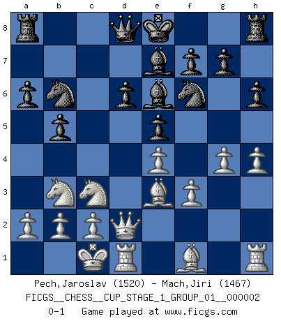 Last move : 0-1 2018 September 23 3:4:10 [Event "FICGS__CHESS__CUP_STAGE_1_GROUP_01__000002"] [Site "FICGS"] [Date "2018.07.02"] [Round "1"] [White "Pech,Jaroslav"] [Black "Mach,Jiri"] [Result "0-1"] [WhiteElo "1520"] [BlackElo "1467"] 1.e4 c5 2.Nf3 d6 3.d4 cxd4 4.Nxd4 Nf6 5.Nc3 a6 6.Be3 e5 7.Nb3 Be6 8.f3 Be7 9.Qd2 Nbd7 10.g4 h6 11.O-O-O b5 12.h4 Nb6 0-1 This chess game has been lost on time (started : 2018.07.02 2:46:7) Sicilian : Najdorf, Byrne (English) attack Queenside Castling by player White (move 11) Player Black won this chess game. Follow this game move after move (download)I look one move ahead... the best ! (Siegbert Tarrasch) Lisa Lane, amerikanische Schachmeisterin, hatte Fischer einmal als stärksten lebenden Spieler bezeichnet. Antwort: Das ist richtig, aber Lisa Lane ist eigentlich nicht in der Lage, das zu beurteilen. (Robert James Fischer) Los problemas de Ajedrez exigen del compositor las mismas virtudes que caracterizan todo el arte de valor: originalidad, invención, concisión, armonía, complejidad e insinceridad explendida. (Vladimir Nabokov) On est toujours la mazette de quelqu'un d'autre. (Anonyme) Convictions are more dangerous enemies of truth than lies. (Friedrich Nietzsche)