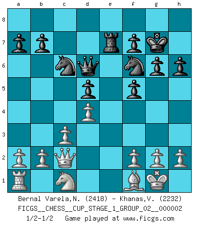 Last move : 1/2-1/2 2018 August 11 1:30:34 [Event "FICGS__CHESS__CUP_STAGE_1_GROUP_02__000002"] [Site "FICGS"] [Date "2018.07.02"] [Round "1"] [White "Bernal Varela,Nelson"] [Black "Khanas,Valeriy"] [Result "1/2-1/2"] [WhiteElo "2418"] [BlackElo "2232"] 1.e4 c6 2.Nf3 d5 3.exd5 cxd5 4.d4 Nf6 5.c3 Nc6 6.Bf4 Bf5 7.Qb3 Qd7 8.Nbd2 e6 9.Nh4 Bd6 10.Bxd6 Qxd6 11.Nxf5 exf5 12.Be2 O-O 13.O-O g6 14.Rfe1 Kg7 15.Qc2 Rfe8 16.Nb3 Re7 17.Bf1 Rae8 18.Rxe7 Rxe7 19.Nc1 h6 1/2-1/2 Caro-Kann defense Kingside Castling by player Black (move 12) Kingside Castling by player White (move 13) This chess game ended in a draw. Follow this game move after move (download)What would Chess be without silly mistakes ? (Kurt Richter) Bobby Fischer ist kein Vorbild für die heutige Jugend. (Viktor Kortschnoi) El Ajedrez demanda una total concentración. (Bobby Fischer) Les pièces de l'échiquier étaient impitoyables. Elles le retenaient, elles l'absorbaient. Il y avait de l'horreur en cela, mais aussi une harmonie unique. Car, qu'y a-t-il dans le monde, à part les échecs ? (V. Nabokov) The ultimate in disposing one's troops is to be without ascertainable shape. Then the most penetrating spies cannot pry in nor can the wise lay plans against you. (Sun Tzu)