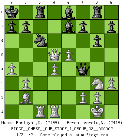 Last move : 1/2-1/2 2018 September 21 22:58:30 [Event "FICGS__CHESS__CUP_STAGE_1_GROUP_02__000002"] [Site "FICGS"] [Date "2018.07.02"] [Round "1"] [White "Munoz Portugal,Guillermo"] [Black "Bernal Varela,Nelson"] [Result "1/2-1/2"] [WhiteElo "2199"] [BlackElo "2418"] 1.e4 e6 2.d4 d5 3.e5 c5 4.c3 Ne7 5.Bd3 Nbc6 6.Ne2 cxd4 7.cxd4 Nb4 8.O-O Nxd3 9.Qxd3 Bd7 10.Nbc3 Qb6 11.Ng3 O-O-O 12.Rd1 Kb8 13.Qf3 Be8 14.b3 Nc6 15.Nc3e2 Rc8 16.Nh5 Ka8 17.h3 Qd8 18.Ne2f4 Rg8 19.Bb2 Qg5 20.Ng3 Qh4 21.Ra1c1 g6 22.a4 Be7 23.Nxd5 exd5 24.Qxd5 Qf4 25.Ne2 Qg5 26.Ng3 Qf4 27.Ne2 Qg5 28.Ng3 Qf4 1/2-1/2 French : Advance variation Kingside Castling by player White (move 8) Queenside Castling by player Black (move 11) This chess game ended in a draw. Follow this game move after move (download)All Chess players should have a hobby. (Savielly Tartakower) Wie bekannt hörte Morphy 1859 auf, Schach zu spielen. Seine Enttäuschung galt nicht so sehr dem Schach, wie den Schachspielern. (Robert James Fischer) La enorme capacidad mental, en la que sin ella no puede un jugador de Ajedrez existir, es demasiado requerida por el Ajedrez al grado de que nunca podrá liberar su mente de este juego. (Albert Einstein) Votre seul travail dans les ouvertures est d'obtenir un milieu de partie jouable. (Lajos Portish) Mac users swear by their computers. PC users swear at their computers. (Author unknown)