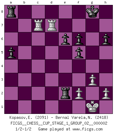 Last move : 1/2-1/2 2018 October 5 7:4:4 [Event "FICGS__CHESS__CUP_STAGE_1_GROUP_02__000002"] [Site "FICGS"] [Date "2018.07.02"] [Round "1"] [White "Kopasov,Evgeny"] [Black "Bernal Varela,Nelson"] [Result "1/2-1/2"] [WhiteElo "2091"] [BlackElo "2418"] 1.d4 e6 2.c4 f5 3.Nf3 b6 4.g3 Bb4+ 5.Bd2 Bxd2+ 6.Qxd2 Nf6 7.Bg2 Bb7 8.O-O O-O 9.Nc3 Ne4 10.Nxe4 Bxe4 11.Rfd1 d6 12.Rac1 h6 13.c5 Nd7 14.Ne1 Nf6 15.Nd3 Bxg2 16.Kxg2 dxc5 17.dxc5 Qd5+ 18.Kg1 Qxa2 19.Qc2 Rfe8 20.Ne5 Qa5 21.Qc4 Qxc5 22.Qxc5 bxc5 23.Rxc5 Reb8 24.Nd7 Rxb2 25.Nxf6+ gxf6 26.Rxc7 Rxe2 27.R1d7 a5 1/2-1/2 Queen's pawn Kingside Castling by player White (move 8) Kingside Castling by player Black (move 8) This chess game ended in a draw. Follow this game move after move (download)It was clear to me that the vulnerable point of the American Grandmaster (Bobby Fischer) was in double-edged, hanging, irrational positions, where he often failed to find a win even in a won position. (Efim Geller) Ich trinke, ich rauche, ich spiele, ich liebe Frauen aber Fernschach ist ein Laster, das ich nicht habe. (Mikhail Nekhemyevich Tal) ¿Quién es tu oponente esta tarde? Esta tarde mi oponente son las piezas negras. (Akiba Rubinstein) D'abord les bases : Jouez et étudiez, puis étudiez et jouez, ensuite jouez et étudiez, puis étudiez et jouez. Deuxièmement : Donnez toujours le meilleur de vous-même ! (Ken Smith) Home computers are being called upon to perform many new functions, including the consumption of homework formerly eaten by the dog. (Doug Larson)
