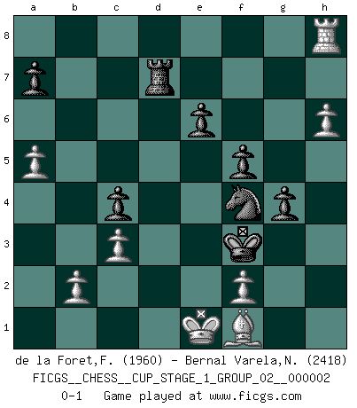 Last move : 0-1 2018 October 14 4:50:32 [Event "FICGS__CHESS__CUP_STAGE_1_GROUP_02__000002"] [Site "FICGS"] [Date "2018.07.02"] [Round "1"] [White "de la Foret,Fred"] [Black "Bernal Varela,Nelson"] [Result "0-1"] [WhiteElo "1960"] [BlackElo "2418"] 1.e4 e6 2.d4 d5 3.Nc3 Nf6 4.Bg5 dxe4 5.Nxe4 Be7 6.Nxf6+ Bxf6 7.Bxf6 Qxf6 8.Nf3 O-O 9.c3 b6 10.Qc2 Bb7 11.Bd3 Bxf3 12.gxf3 Qh4 13.Be4 c6 14.Qe2 Rc8 15.Bc2 Nd7 16.Qe4 Qh5 17.O-O-O Nf6 18.Qf4 Nd5 19.Qg3 Qh6+ 20.Kb1 Qf6 21.h4 h5 22.Rhe1 g6 23.Re5 Kf8 24.Be4 Rab8 25.Rg5 Rb7 26.Qd6+ Ke8 27.a3 Rd7 28.Qg3 Ne7 29.Rg1 c5 30.dxc5 bxc5 31.Kc1 Kf8 32.Qe5 Qxe5 33.Rxe5 R8c7 34.Rd1 Rxd1+ 35.Kxd1 f5 36.Bd3 c4 37.Bf1 Kf7 38.Rb5 Nd5 39.Rb8 Kg7 40.Ke2 Kf6 41.Kd2 g5 42.Rh8 g4 43.fxg4 hxg4 44.a4 Nf4 45.h5 Ke5 46.h6 Ke4 47.a5 Kf3 48.Ke1 Rd7 0-1 French : Burn variation Kingside Castling by player Black (move 8) Queenside Castling by player White (move 17) Player Black won this chess game. Follow this game move after move (download)War is the child of passion, passion is the child of narcissism and narcissism is the child. (...) Another game ? (Thibault de Vassal) Mein Gehirn das ist mein zweitwichtigstes Organ [Aus dem Film: Der Schläfer]. (Woody Allen) Cada Peón es potencialmente una Reina. (James Mason) Toutes les manuvres exécutées sur une colonne ouverte ont pour but ultime l'intrusion définitive sur la septième ou la huitième rangée, en plein cur de la position ennemie. (Aaron Nimzovitch) If you are good, you will be assigned all the work. If you are really good, you will get out of it. (Dan Rotaru)