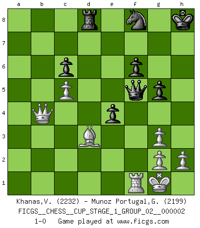 Last move : 1-0 2018 September 17 13:23:45 [Event "FICGS__CHESS__CUP_STAGE_1_GROUP_02__000002"] [Site "FICGS"] [Date "2018.07.02"] [Round "1"] [White "Khanas,Valeriy"] [Black "Munoz Portugal,Guillermo"] [Result "1-0"] [WhiteElo "2232"] [BlackElo "2199"] 1.d4 Nf6 2.c4 e6 3.Nf3 d5 4.Nc3 c6 5.Bg5 h6 6.Bxf6 Qxf6 7.e3 Nd7 8.Bd3 Bb4 9.O-O O-O 10.Qb3 Qe7 11.c5 Ba5 12.e4 Rd8 13.Rfd1 Bc7 14.Rac1 Bf4 15.Rc2 Bc7 16.a3 Rb8 17.Re2 dxe4 18.Nxe4 b6 19.Qc2 bxc5 20.dxc5 Nf8 21.Red2 Bf4 22.Re2 Bc7 23.Re3 f6 24.b4 e5 25.Ng3 a5 26.Nh4 axb4 27.Ngf5 Qe8 28.Nxh6+ Kh8 29.N6f5 Be6 30.Rh3 Kg8 31.axb4 Rxb4 32.Rg3 g5 33.Nh6+ Kh8 34.N4f5 e4 35.Qc3 Qg6 36.Qxb4 Bxg3 37.fxg3 Bxf5 38.Nxf5 Qxf5 39.Rf1 1-0 This chess game has been lost on time (started : 2018.07.02 2:46:8) Queen's pawn game Kingside Castling by player White (move 9) Kingside Castling by player Black (move 9) Player White won this chess game. Follow this game move after move (download)In Fischer's hands, a slight theoretical advantage is as good a being a Queen ahead. (Isaac Kashdan) Kasparov stellt für gewöhnlich die Regeln auf und bricht sie dann selbst wieder. (Alexej Shirov) El Ajedrez es en su esencia, un juego. En su forma, un arte. Y en su ejecución, una ciencia. (Baron Tassilo) Même si l'adversaire joue le coup analysé précédemment, recommencez l'analyse en voyant la nouvelle position. Première règle de Blumenfeld Sometimes it pays to stay in bed in Monday, rather than spending the rest of the week debugging Monday's code. (Dan Salomon)