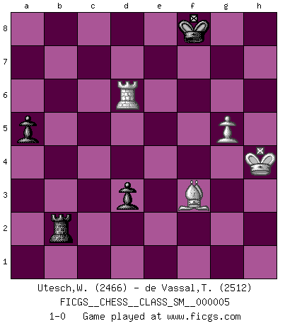 Last move : 1-0 2008 January 5 17:15:35 [Event "FICGS__CHESS__CLASS_SM__000005"] [Site "FICGS"] [Date "2007.05.11"] [Round "1"] [White "Utesch,Wolfgang"] [Black "de Vassal,Thibault"] [Result "1-0"] [WhiteElo "2466"] [BlackElo "2512"] 1.d4 d5 2.c4 c6 3.Nc3 Nf6 4.cxd5 cxd5 5.Bf4 Nc6 6.e3 Bf5 7.Nf3 e6 8.Ne5 Nxe5 9.Bxe5 Nd7 10.Bg3 Rc8 11.Qb3 Qa5 12.Be2 a6 13.f3 Qb4 14.Kf2 Qxb3 15.axb3 Bb4 16.Rhc1 Ke7 17.Ra4 a5 18.R4a1 Nb6 19.e4 Bg6 20.Ke3 f6 21.Na2 Rxc1 22.Rxc1 Bd6 23.Bxd6+ Kxd6 24.Nc3 Rc8 25.Ra1 dxe4 26.fxe4 Ra8 27.Nb5+ Kd7 28.h4 Be8 29.h5 h6 30.Kf4 Bf7 31.Bf3 Kc6 32.Na3 Kd7 33.e5 Nd5+ 34.Kg3 Bg8 35.Nc4 Ra7 36.Be4 Bf7 37.Kh4 b6 38.Nd6 Be8 39.b4 Nc7 40.Ra3 Kd8 41.bxa5 bxa5 42.Rg3 fxe5 43.Rxg7 exd4 44.Nxe8 Kxe8 45.Rh7 Nb5 46.Bc6+ Kf8 47.Rxh6 Nd6 48.Rxe6 Nf7 49.g4 d3 50.h6 Nxh6 51.Rxh6 Ra6 52.g5 Rb6 53.Bf3 Rxb2 54.Rd6 1-0 Comment by player 1 : Wolfgang Utesch : Hi Thibault, thank you for the game - Happy New Year! Best, Wolfgang QGD Slav defense 10 pieces endgame at move 50 : White KRBPP , Black KRNPP WHITE : King + 1 Rook 1 Bishop 2 Pawns BLACK : King + 1 Rook 1 Knight 2 Pawns 9 pieces endgame at move 51 : White KRBPP , Black KRPP WHITE : King + 1 Rook 1 Bishop 2 Pawns BLACK : King + 1 Rook 2 Pawns 8 pieces endgame at move 53 : White KRBP , Black KRPP WHITE : King + 1 Rook 1 Bishop 1 Pawn BLACK : King + 1 Rook 2 Pawns Player White won this chess game. Follow this game move after move (download)Bobby Fischer's current state of mind is indeed a tragedy. One of the world's greatest Chess players - the pride and sorrow of American Chess. (Frank Brady) Du musst nicht gut spielen, es reicht, wenn du besser spielst als dein Gegner. (Anonymous) Todo se encuentra en un estado de flujo y esto incluye al mundo del Ajedrez. (Mikhail Botvinnik) RxDa4 pat (...) There is far too much law for those who can afford it and far too little for those who cannot. (Derek Bok)