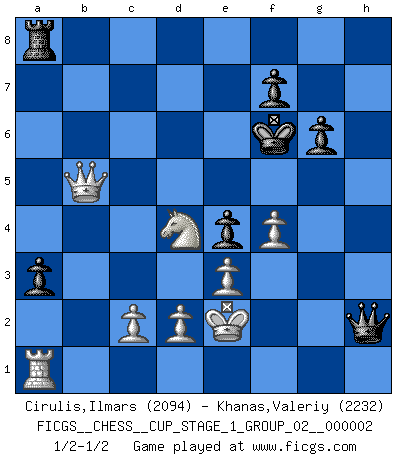Last move : 1/2-1/2 2018 July 16 16:57:11 [Event "FICGS__CHESS__CUP_STAGE_1_GROUP_02__000002"] [Site "FICGS"] [Date "2018.07.02"] [Round "1"] [White "Cirulis,Ilmars"] [Black "Khanas,Valeriy"] [Result "1/2-1/2"] [WhiteElo "2094"] [BlackElo "2232"] 1.b4 e5 2.a3 d5 3.Bb2 Nd7 4.Nf3 e4 5.Nd4 Ngf6 6.e3 a5 7.b5 Ne5 8.f4 Bg4 9.Be2 Nc4 10.Bc3 Bxe2 11.Qxe2 Bc5 12.g4 h6 13.h3 a4 14.Nf5 Rh7 15.Bd4 Bxd4 16.Nxd4 g6 17.Nc3 Qd6 18.Rb1 Nxa3 19.Ra1 c5 20.bxc6 bxc6 21.Qd1 Kf8 22.Nxc6 Nc4 23.Nd4 a3 24.Ncb5 Qe7 25.Kf2 Rh8 26.Qe2 Kg7 27.Rhb1 Qc5 28.Rb3 Rhe8 29.Qe1 Ra4 30.Kg2 Qe7 31.Nc3 Ra6 32.Qe2 Qc7 33.Rb5 Rea8 34.h4 Ra5 35.g5 hxg5 36.hxg5 Nh5 37.Nxd5 Qd7 38.Nf6 Nxf6 39.gxf6+ Kxf6 40.Qxc4 Rxb5 41.Qxb5 Qg4+ 42.Kf2 Qh4+ 43.Ke2 Qh2+ 1/2-1/2 Polish (Sokolsky) opening This chess game ended in a draw. Follow this game move after move (download)Chess is in its essence a game, in its form an art, and in its execution a science. (Baron Tassilo) Zum Sieg gelangt man nicht, wenn man gut, sondern nur wenn man besser spielt (Savielly Grigorievitsch Tartakower) Aquel que ve no otra dirección en el juego que la de dar Jaque Mate a su oponente, nunca será un buen jugador de Ajedrez. (Euwe) On croit qu'il y a plus de mauvais joueurs que de bons joueurs, c'est faux : Il y a autant de joueurs qui gagnent que de joueurs qui perdent. (Philippe Geluck) O divine art of subtlety and secrecy! Through you we learn to be invisible, through you inaudible and hence we can hold the enemy's fate in our hands. (Sun Tzu)